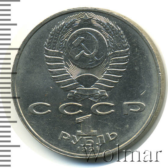 Сверху герб СССР с 15 витками ленты, под ним буквы «СССР», ниже обозначение достоинства монеты цифра «1» и ниже слово «РУБЛЬ», внизу у канта год выпуска монеты «1991».