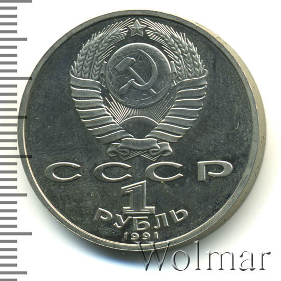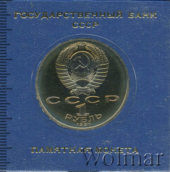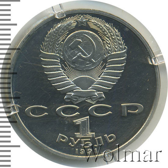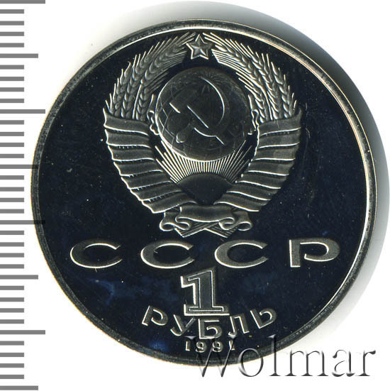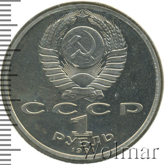 Сверху герб СССР с 15 витками ленты, под ним буквы «СССР», ниже обозначение достоинства монеты цифра «1» и ниже слово «РУБЛЬ», внизу у канта год выпуска монеты «1991».