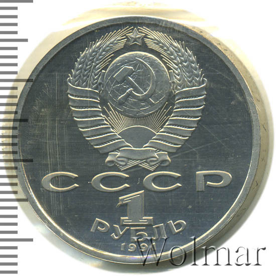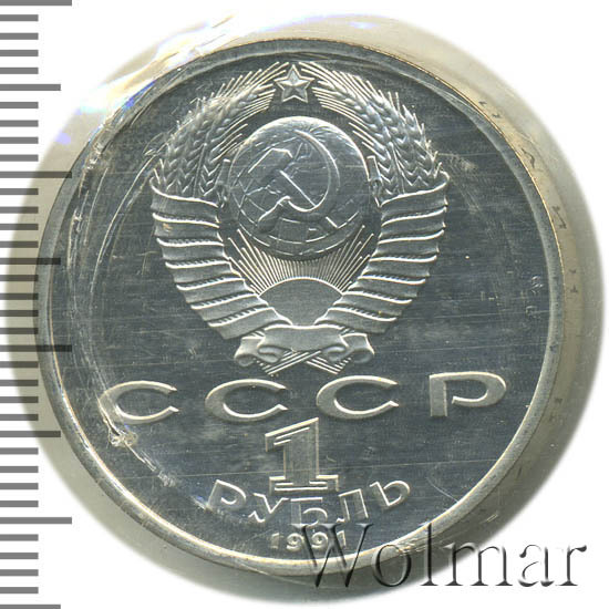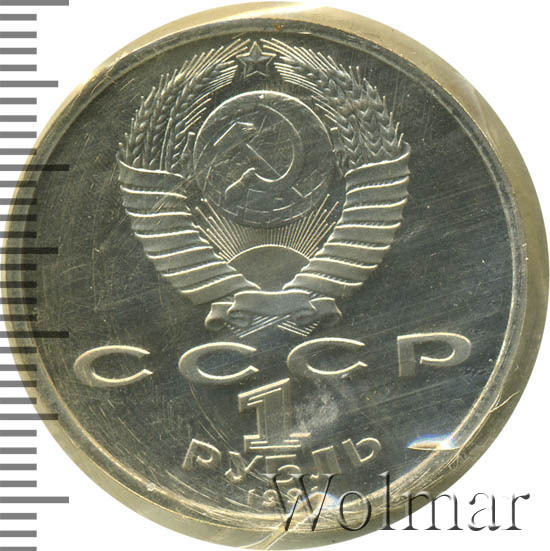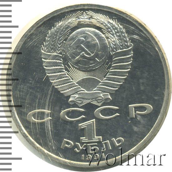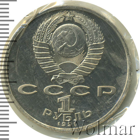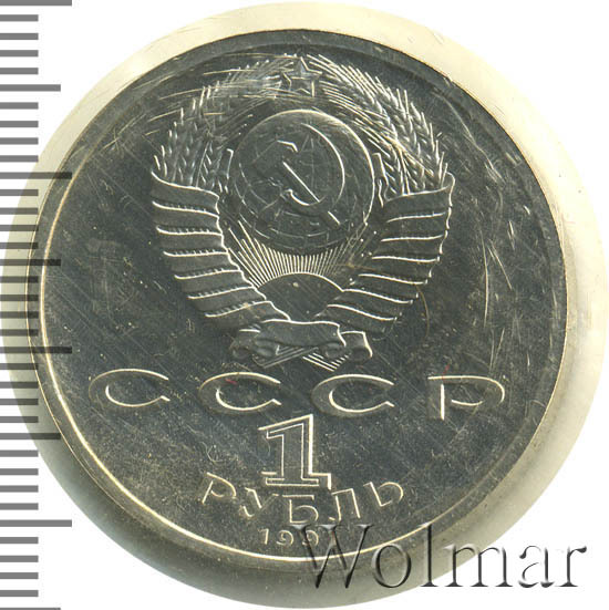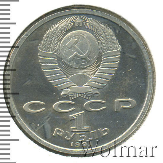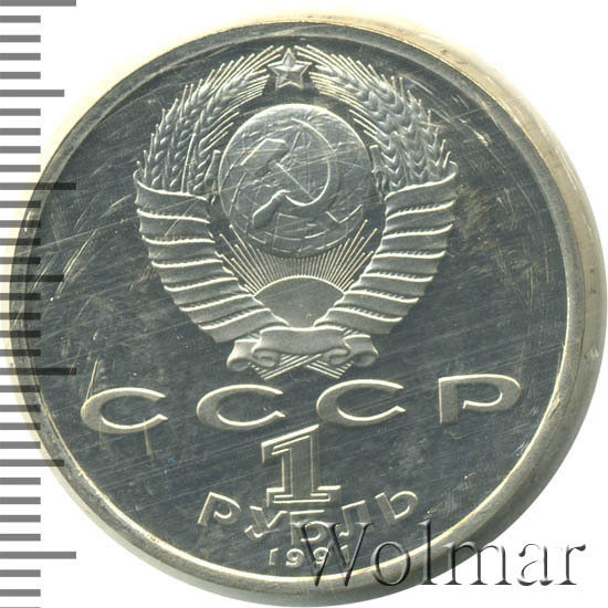Сверху герб СССР с 15 витками ленты, под ним буквы «СССР», ниже обозначение достоинства монеты цифра «1» и ниже слово «РУБЛЬ», внизу у канта год выпуска монеты «1991».