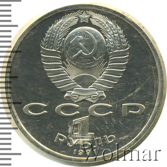 Сверху герб СССР с 15 витками ленты, под ним буквы «СССР», ниже обозначение достоинства монеты цифра «1» и ниже слово «РУБЛЬ», внизу у канта год выпуска монеты «1991».