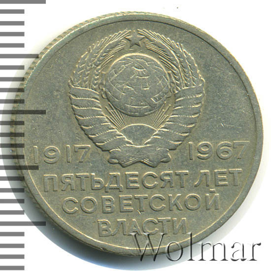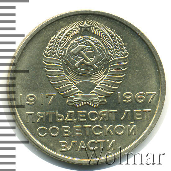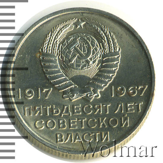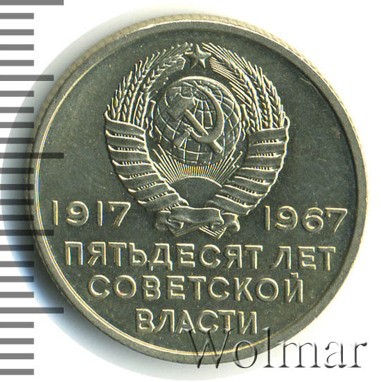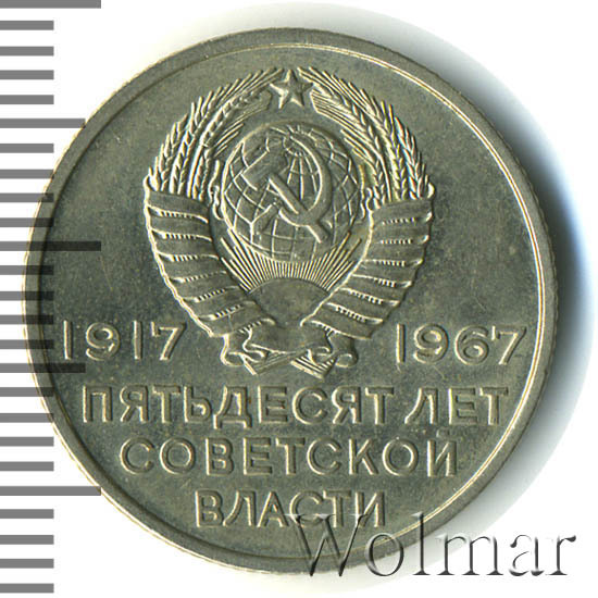 Сверху герб СССР с 15 витками ленты, слева от герба год Великой Октябрьской социалистической революции «1917», справа год выпуска монеты «1967», ниже слова «ПЯТЬДЕСЯТ ЛЕТ СОВЕТСКОЙ ВЛАСТИ».