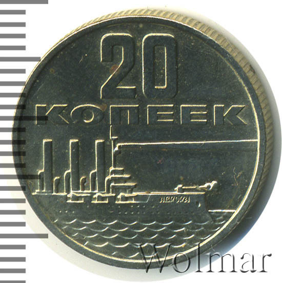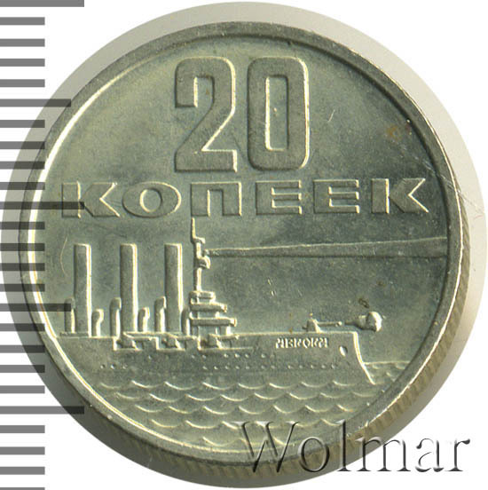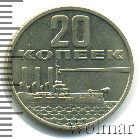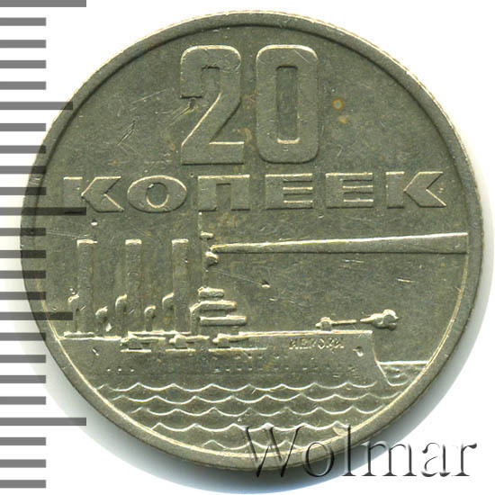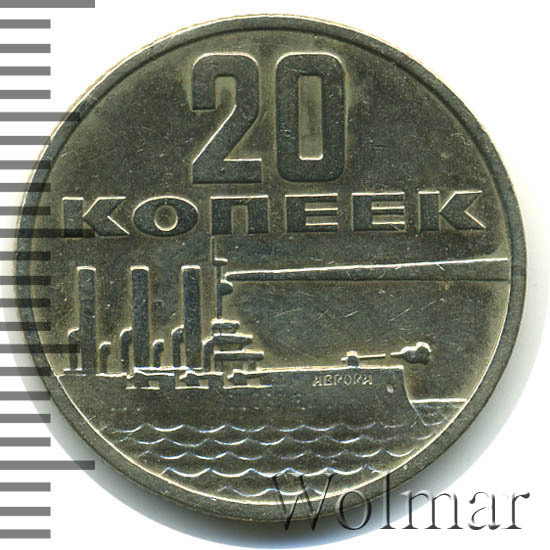 На юбилейной монете 20 копеек 1967г. был изображен знаменитый крейсер «Аврора», широко известный нам своей ролью в Октябрьской революции 1917г. Пресловутый холостой выстрел с "Авроры" явился сигналом к штурму Зимнего дворца, в последствии крейсер стал одним из символов Октябрьской революции. "Аврора" - крейсер 1-го ранга Балтийского флота участвовал в русско-японской войне, в морском походе закончившемся Цусимским сражением; также принимал непосредственное участие в Первой мировой войне. Под конец Великой Отечественной войны крейсер решено было установить у Петроградской набережной СПб в качестве музея-памятника истории флота и учебного корабля Ленинградского Нахимовского военно-морского училища.