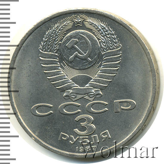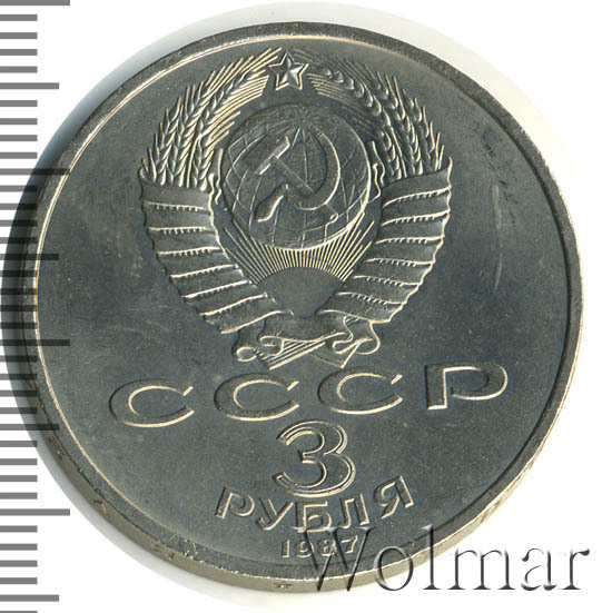 Сверху герб СССР с 15 витками ленты, под ним буквы «СССР», ниже обозначение достоинства монеты цифра «3» и ниже слово «РУБЛЯ», внизу у канта год выпуска монеты «1987».
