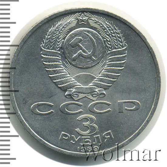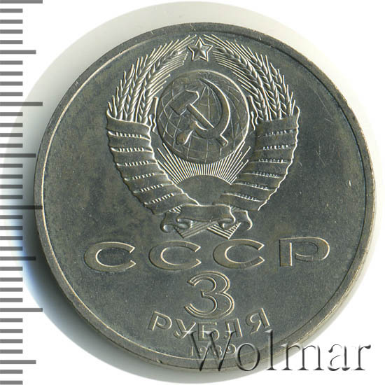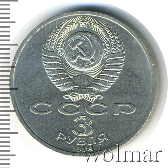 Сверху герб СССР с 15 витками ленты, под ним буквы «СССР», ниже обозначение достоинства монеты цифра «3» и ниже слово «РУБЛЯ», внизу у канта год выпуска монеты «1989».
