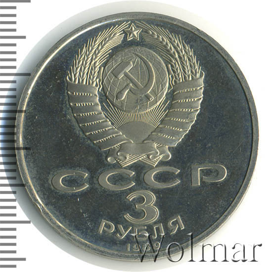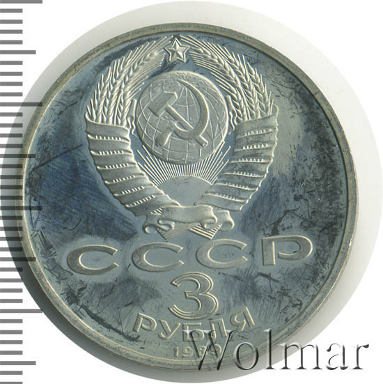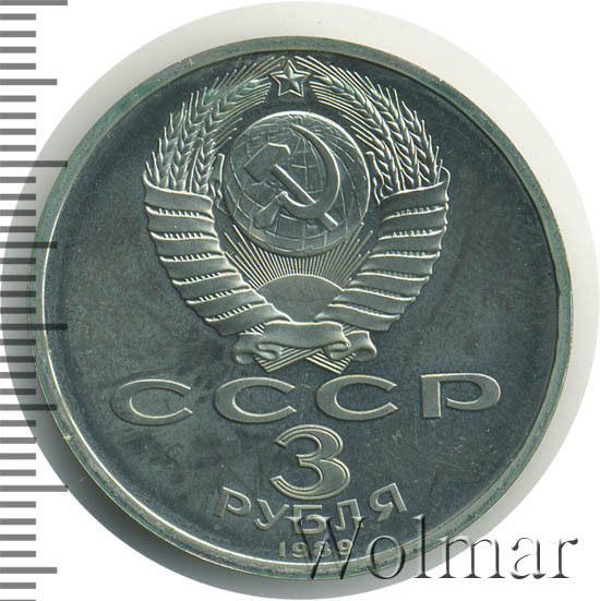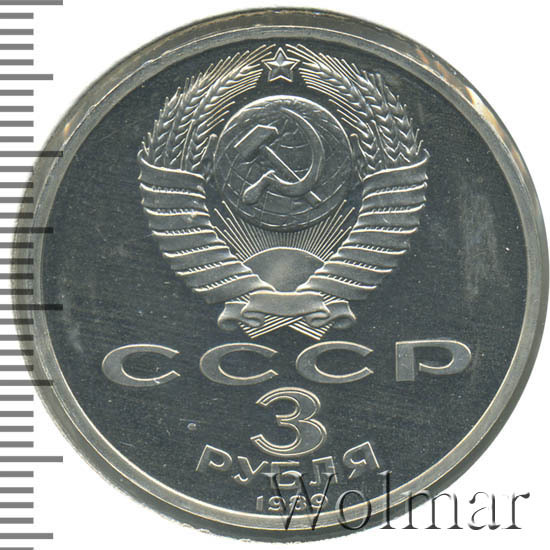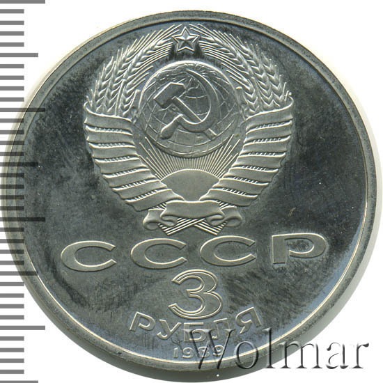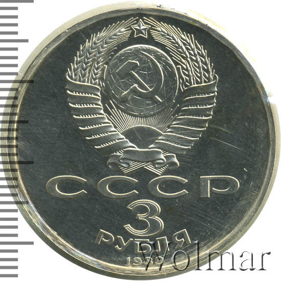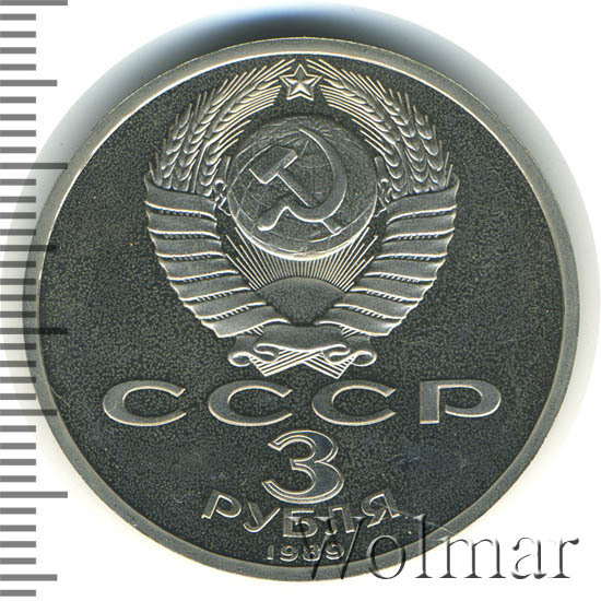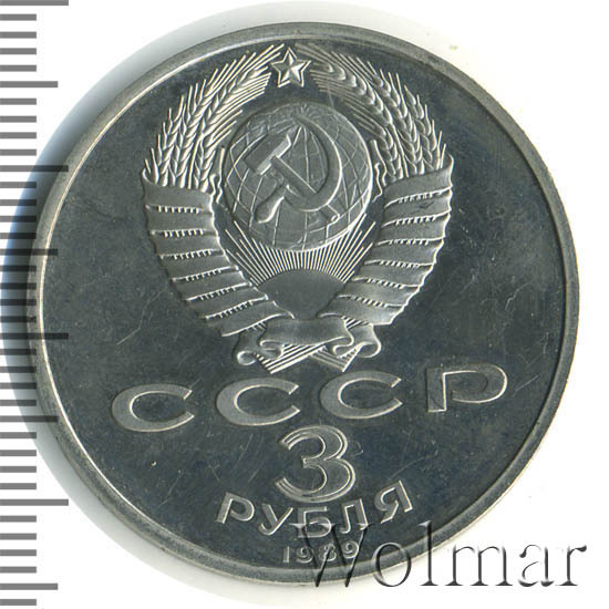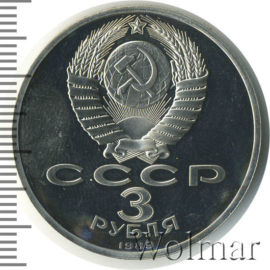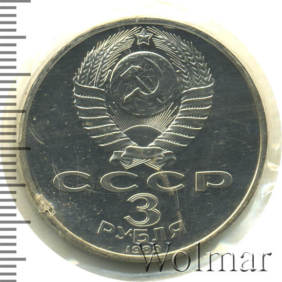 Сверху герб СССР с 15 витками ленты, под ним буквы «СССР», ниже обозначение достоинства монеты цифра «3» и ниже слово «РУБЛЯ», внизу у канта год выпуска монеты «1989».