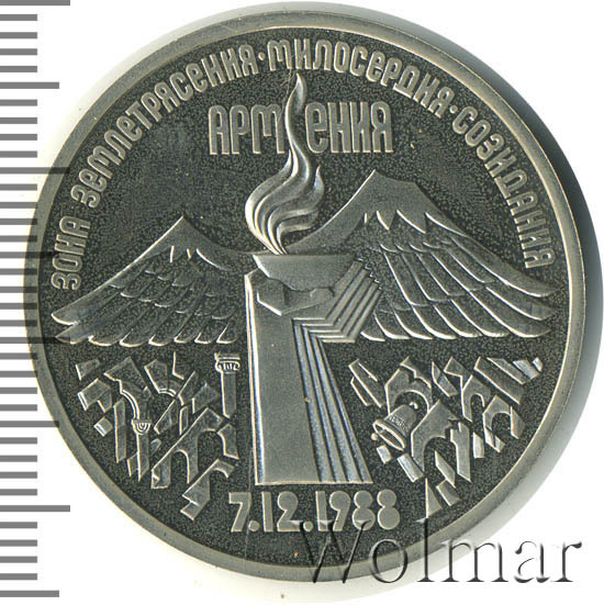 В центре на фоне гор изображение факела в виде рук, держащих чашу с пламенем. По обеим сторонам факела под горами символично изображены руины - последствие землетрясения. Под факелом дата «7.12.1988». Вверху надпись «АРМЕНИЯ», разделенная пламенем на две части «АРМ» и «ЕНИЯ». По окружности надписи «ЗОНА ЗЕМЛЕТРЯСЕНИЯ»,«МИЛОСЕРДИЯ»,«СОЗИДАНИЯ», разделённые точками.
