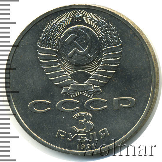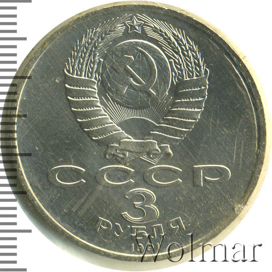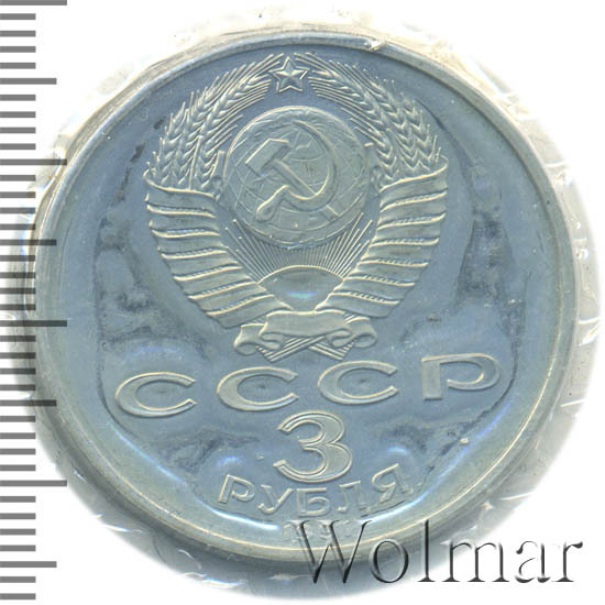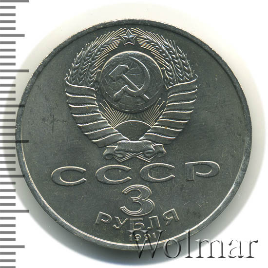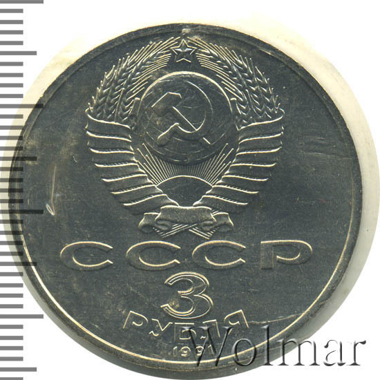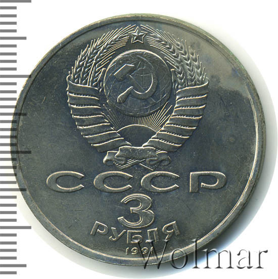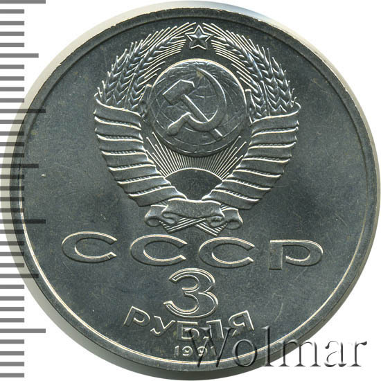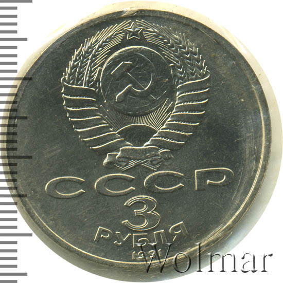 Сверху герб СССР с 15 витками ленты, под ним буквы «СССР», ниже обозначение достоинства монеты цифра «3» и ниже слово «РУБЛЯ», внизу у канта год выпуска монеты «1991».