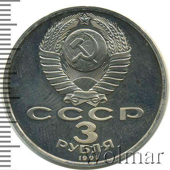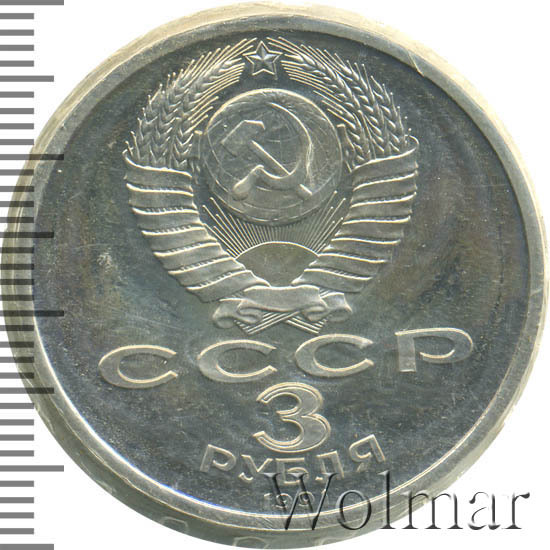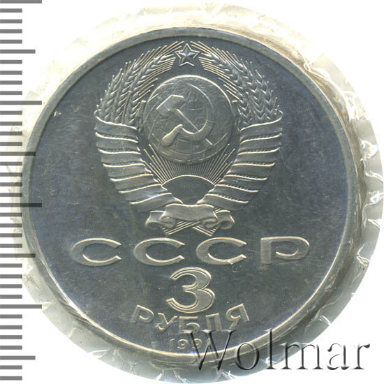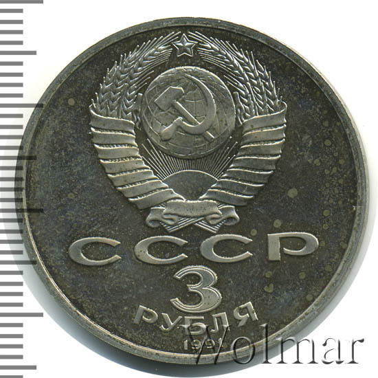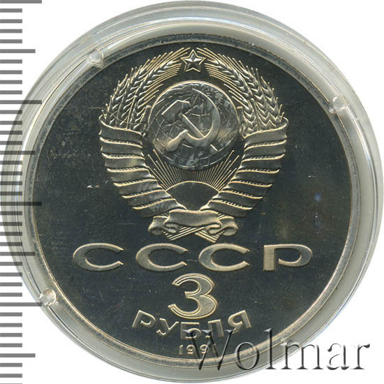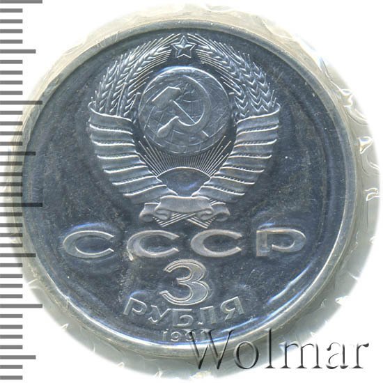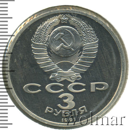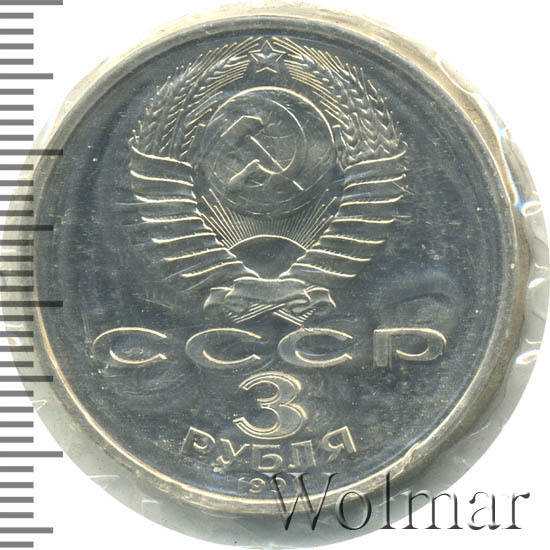 Сверху герб СССР с 15 витками ленты, под ним буквы «СССР», ниже обозначение достоинства монеты цифра «3» и ниже слово «РУБЛЯ», внизу у канта год выпуска монеты «1991».