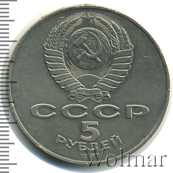 Сверху герб СССР с 15 витками ленты, под ним буквы «СССР», ниже обозначение достоинства монеты цифра «5» и ниже слово «РУБЛЕЙ», внизу у канта год выпуска монеты «1987».