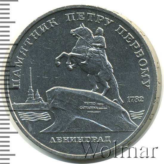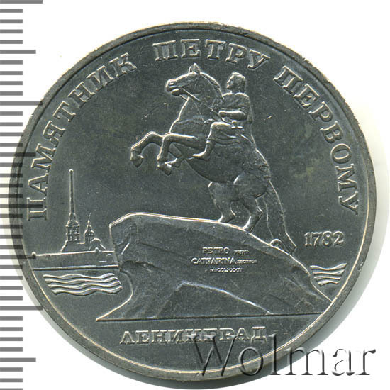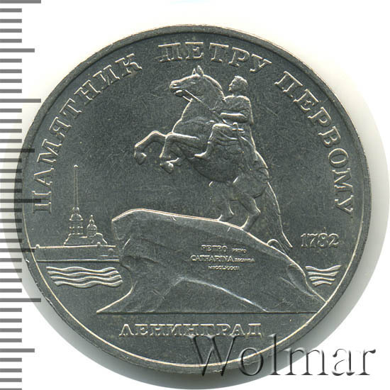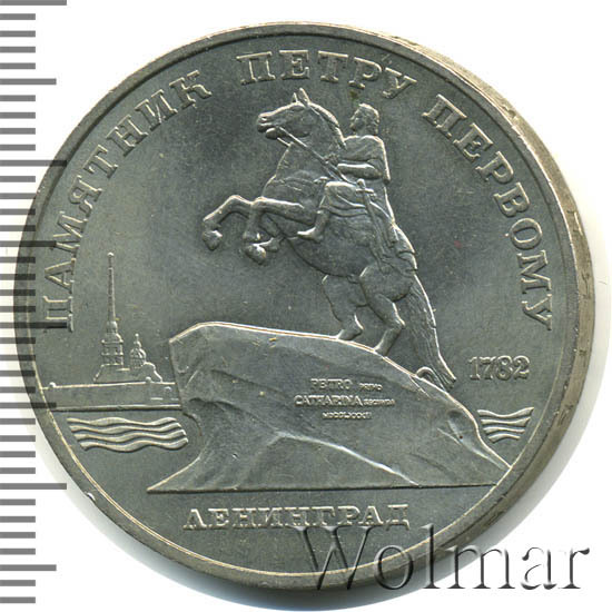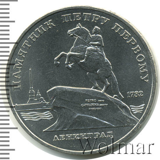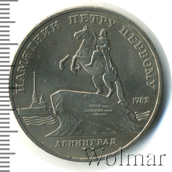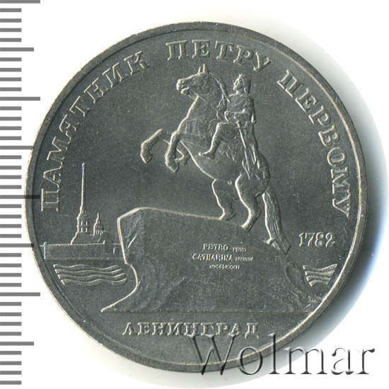 В центре памятник Петру Первому в Ленинграде на фоне силуэта Петропавловской крепости. Под ним надпись «ЛЕНИНГРАД». Справа от памятника дата «1782». Вверху вдоль внешнего ободка монеты полукругом надпись «ПАМЯТНИК ПЕТРУ ПЕРВОМУ».