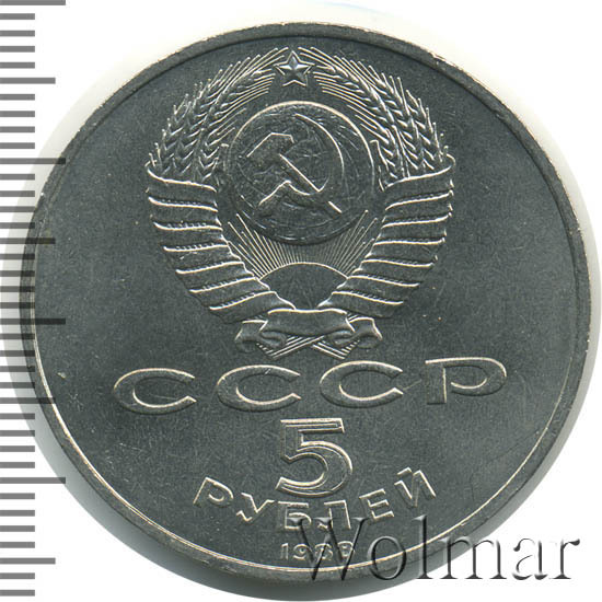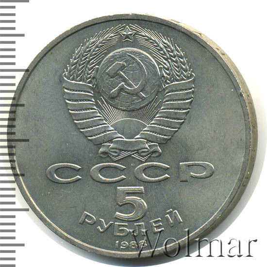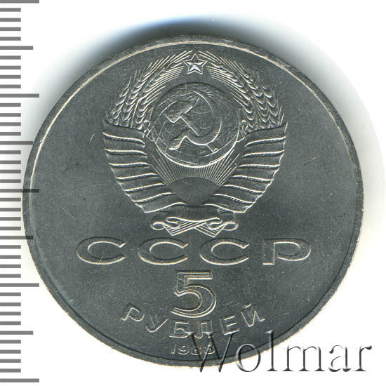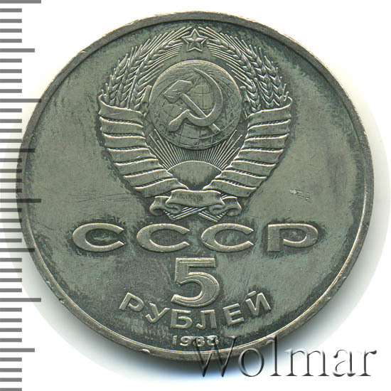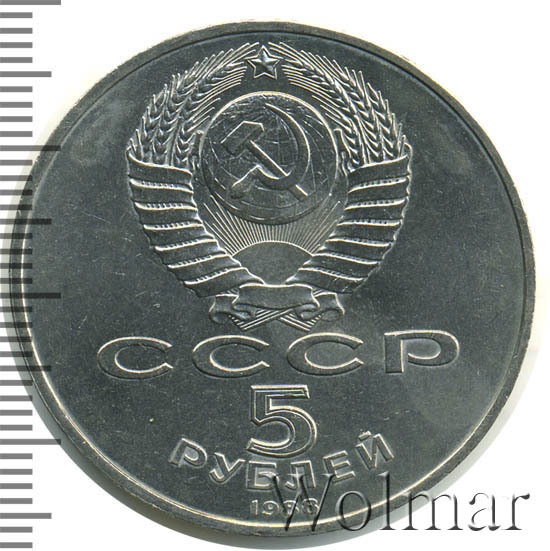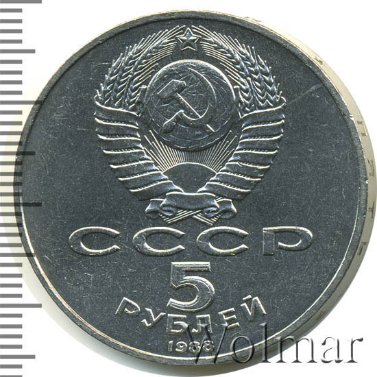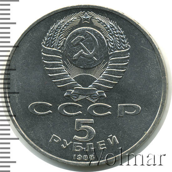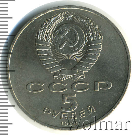 Сверху герб СССР с 15 витками ленты, под ним буквы «СССР», ниже обозначение достоинства монеты цифра «5» и ниже слово «РУБЛЕЙ», внизу у канта год выпуска монеты «1988».
