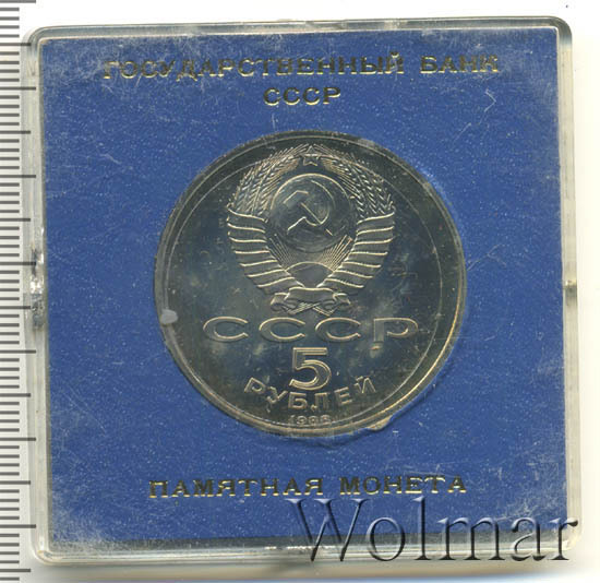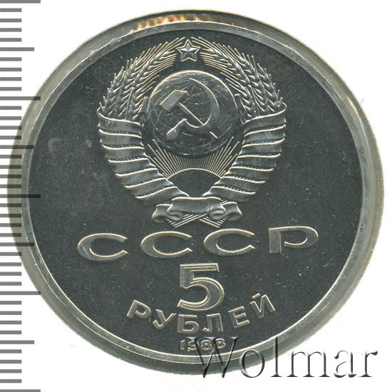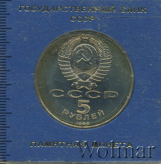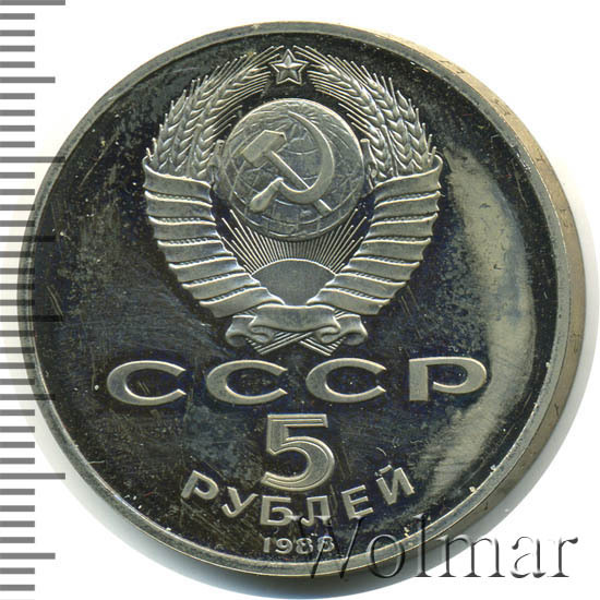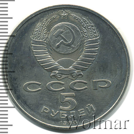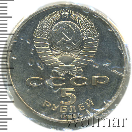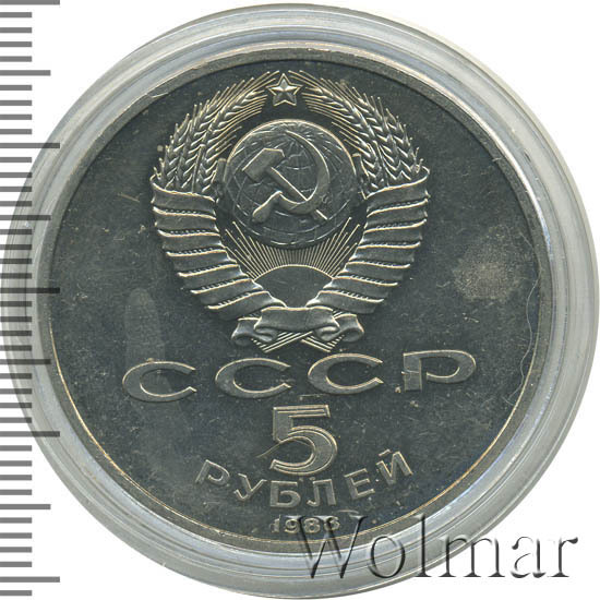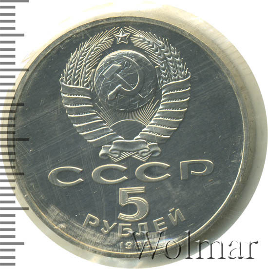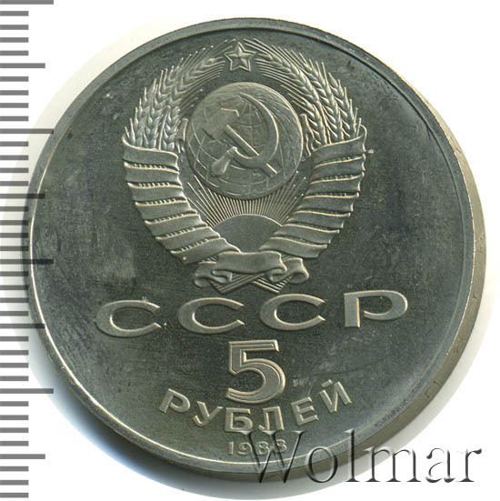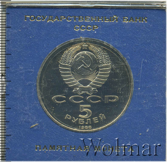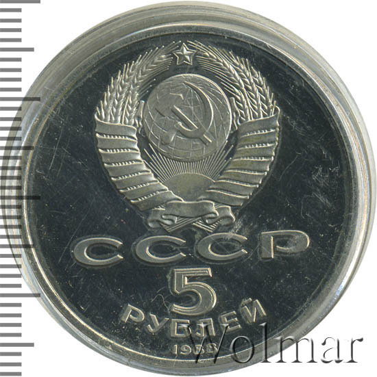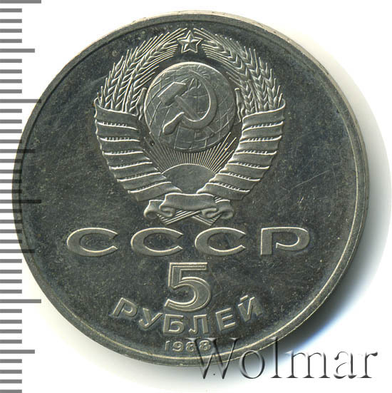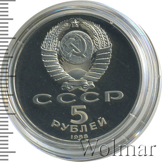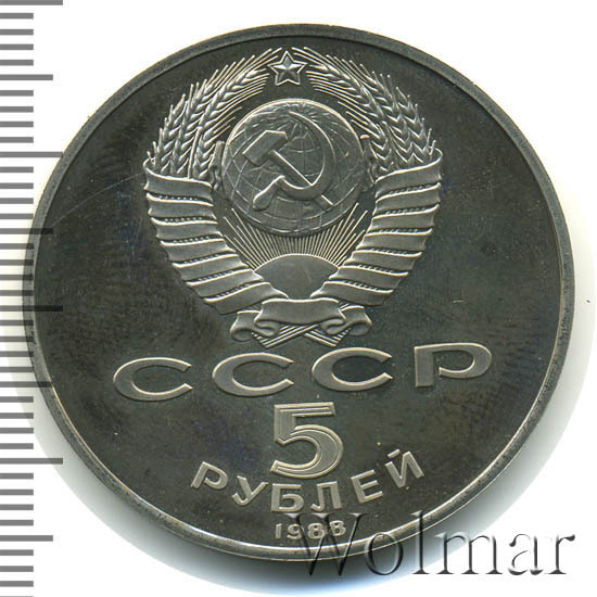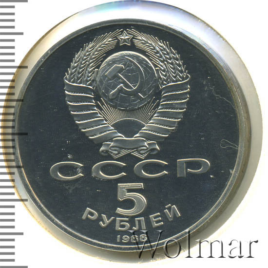 Сверху герб СССР с 15 витками ленты, под ним буквы «СССР», ниже обозначение достоинства монеты цифра «5» и ниже слово «РУБЛЕЙ», внизу у канта год выпуска монеты «1988».