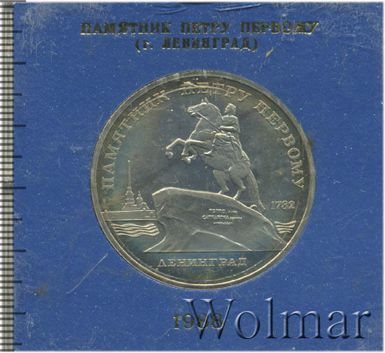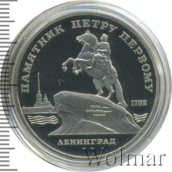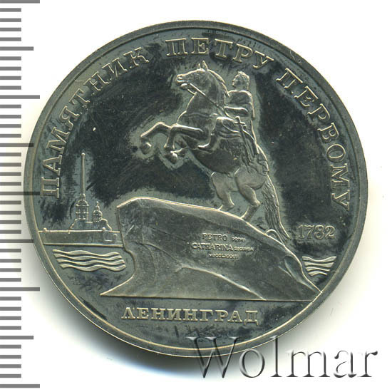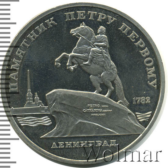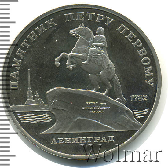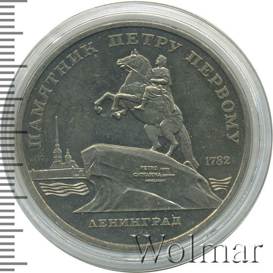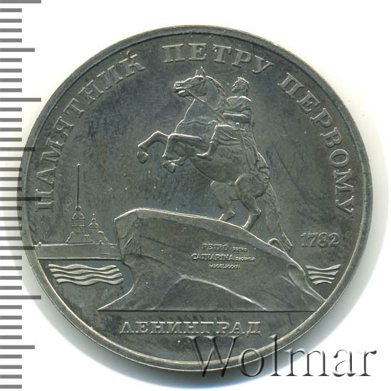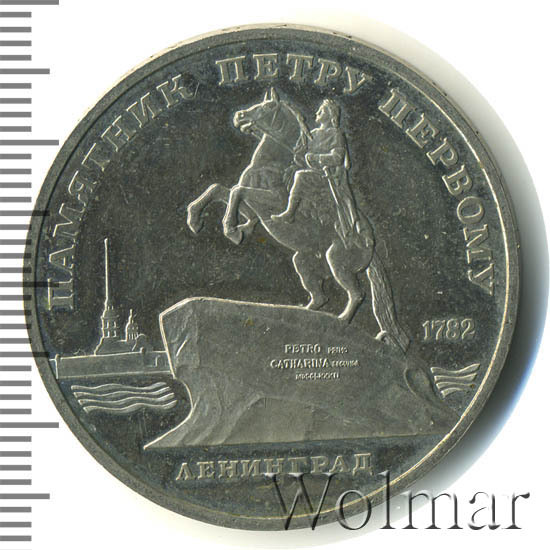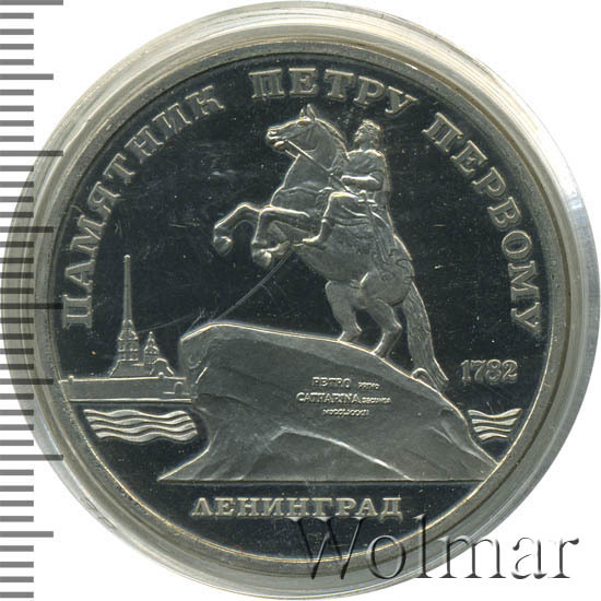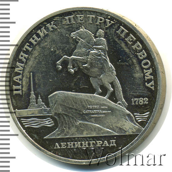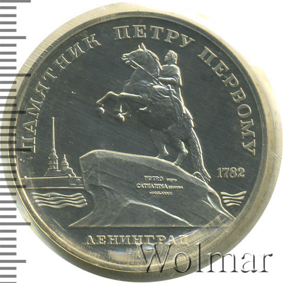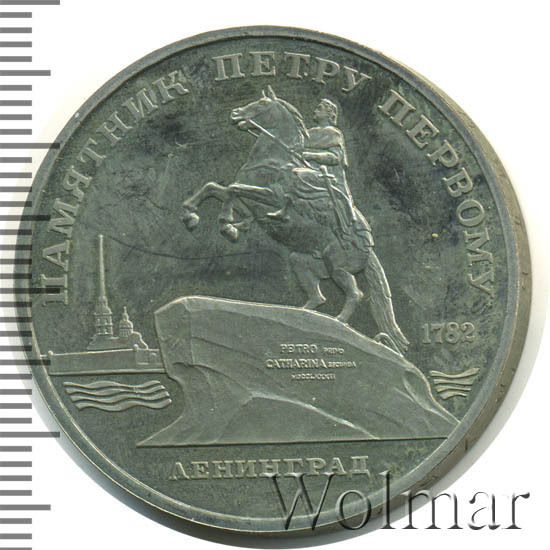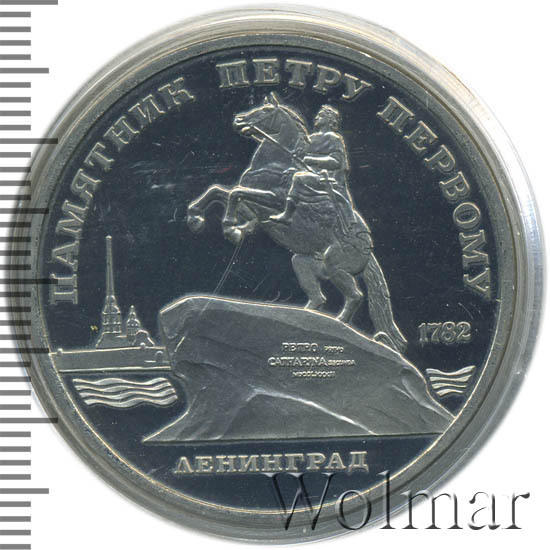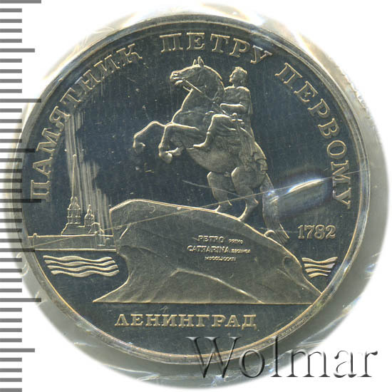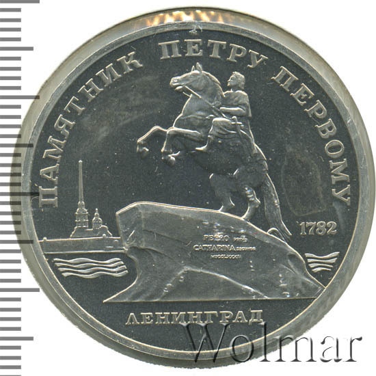 В центре памятник Петру Первому в Ленинграде на фоне силуэта Петропавловской крепости. Под ним надпись «ЛЕНИНГРАД». Справа от памятника дата «1782». Вверху вдоль внешнего ободка монеты полукругом надпись «ПАМЯТНИК ПЕТРУ ПЕРВОМУ».