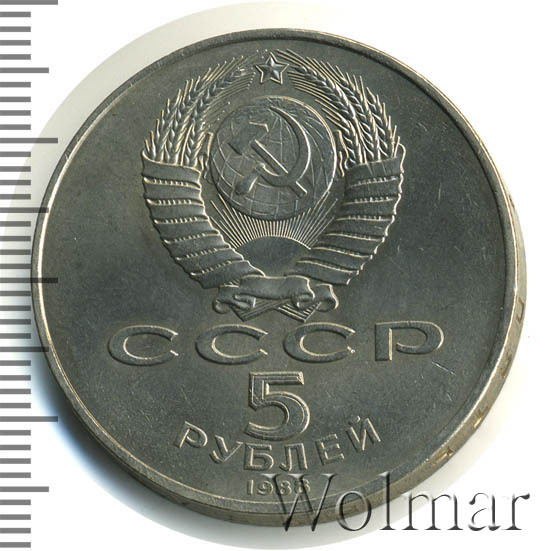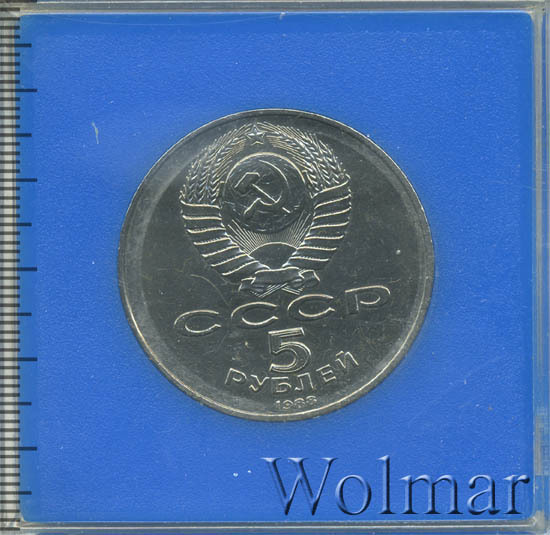 Сверху герб СССР с 15 витками ленты, под ним буквы «СССР», ниже обозначение достоинства монеты цифра «5» и ниже слово «РУБЛЕЙ», внизу у канта год выпуска монеты «1988».