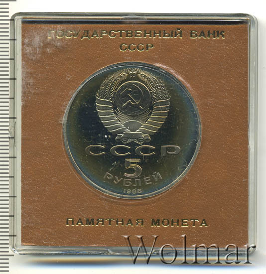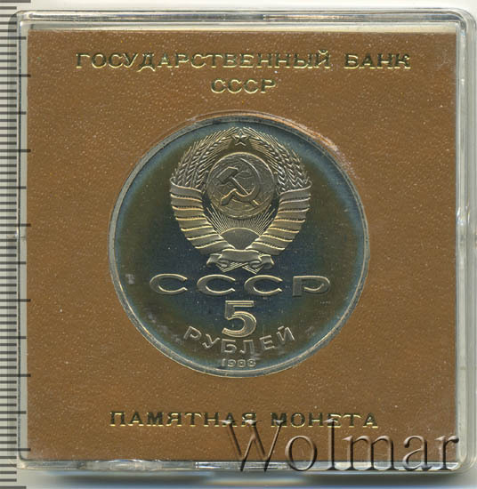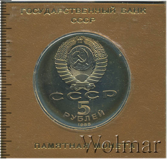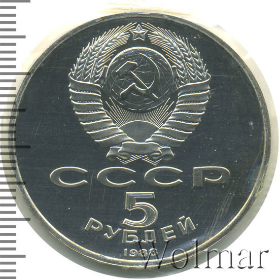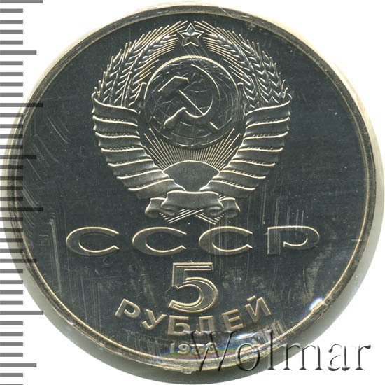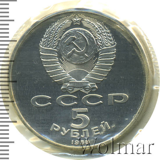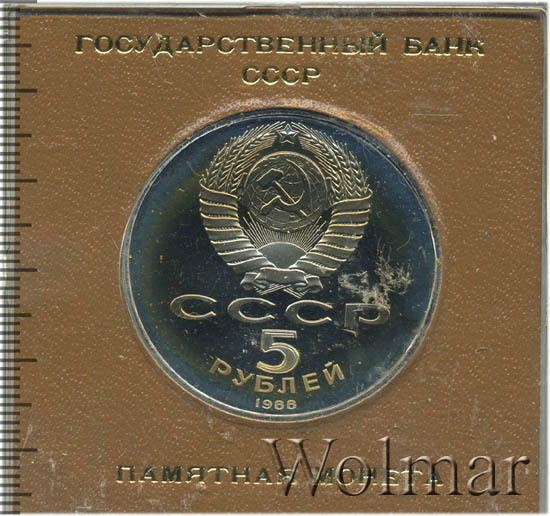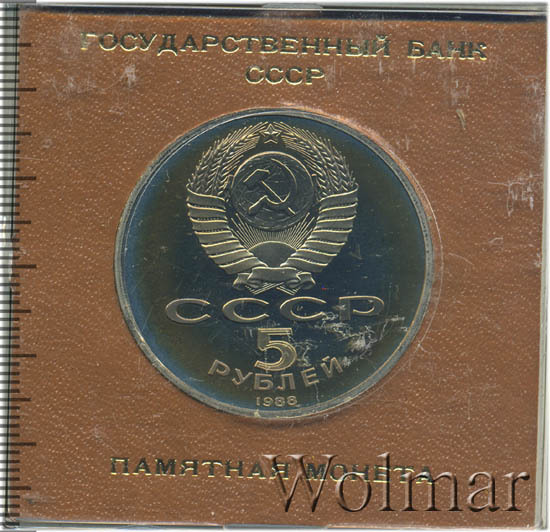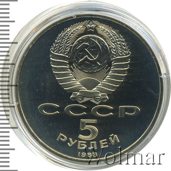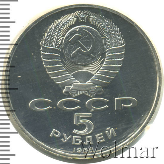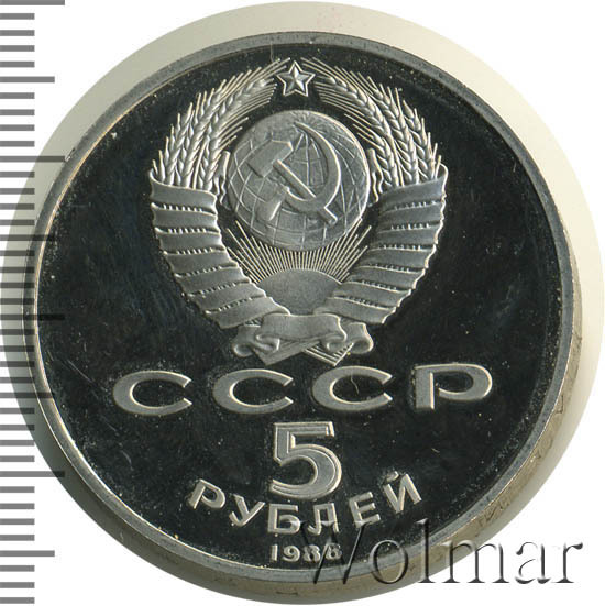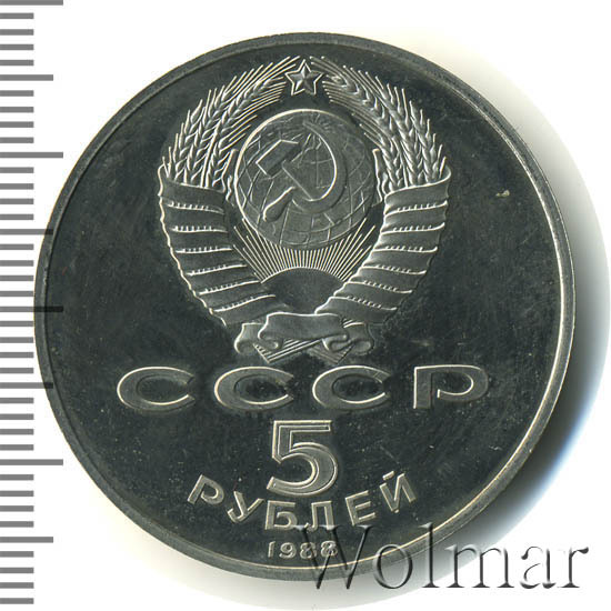Сверху герб СССР с 15 витками ленты, под ним буквы «СССР», ниже обозначение достоинства монеты цифра «5» и ниже слово «РУБЛЕЙ», внизу у канта год выпуска монеты «1988».