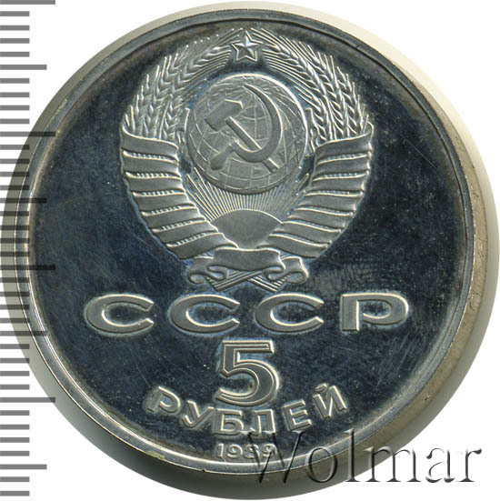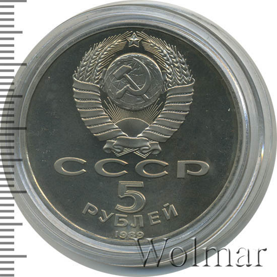 Сверху герб СССР с 15 витками ленты, под ним буквы «СССР», ниже обозначение достоинства монеты цифра «5» и ниже слово «РУБЛЕЙ», внизу у канта год выпуска монеты «1989».