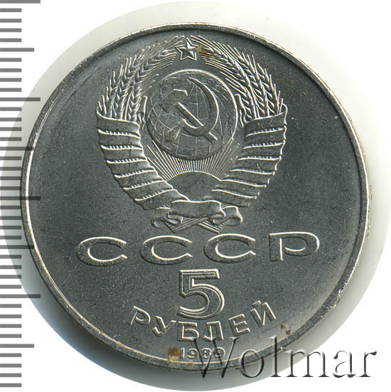 Сверху герб СССР с 15 витками ленты, под ним буквы «СССР», ниже обозначение достоинства монеты цифра «5» и ниже слово «РУБЛЕЙ», внизу у канта год выпуска монеты «1989».