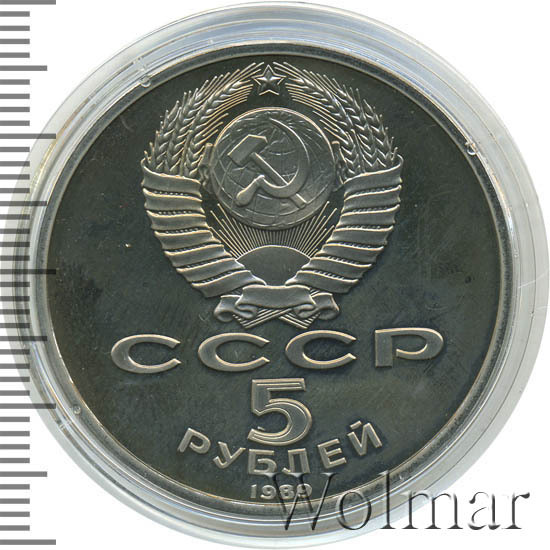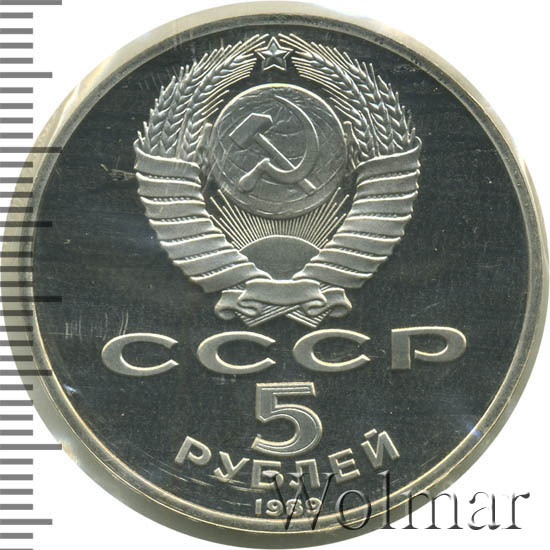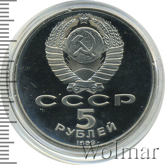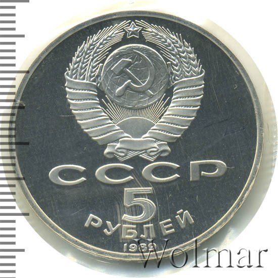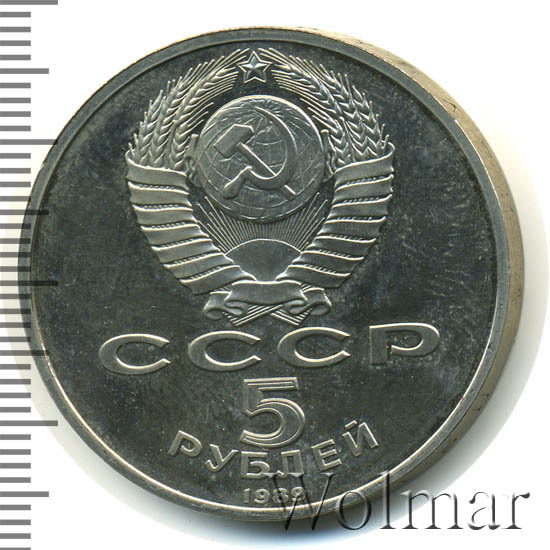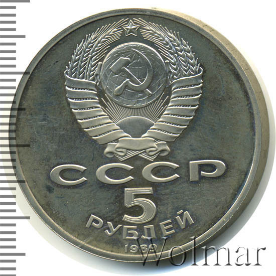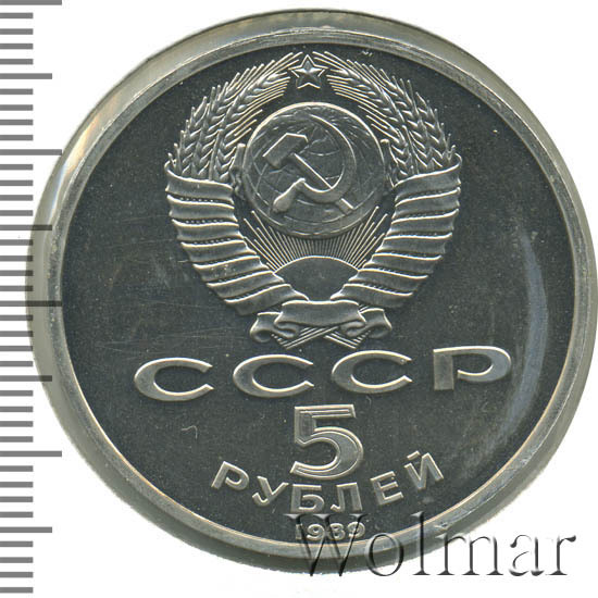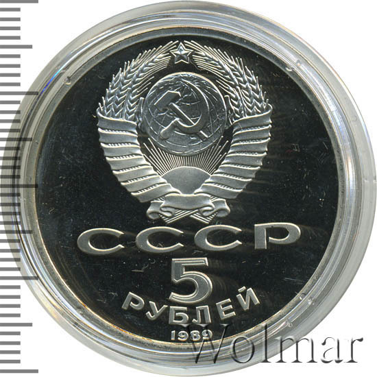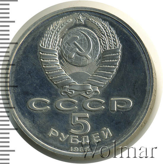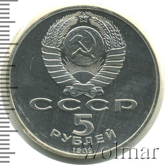 Сверху герб СССР с 15 витками ленты, под ним буквы «СССР», ниже обозначение достоинства монеты цифра «5» и ниже слово «РУБЛЕЙ», внизу у канта год выпуска монеты «1989».