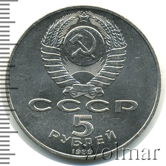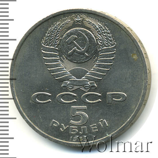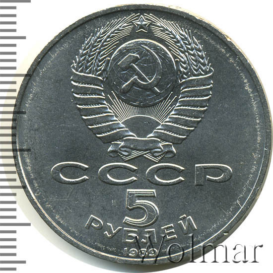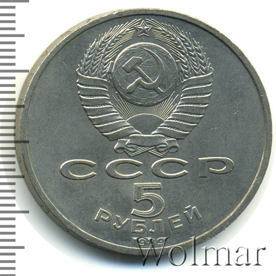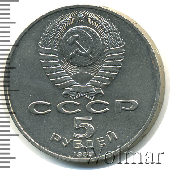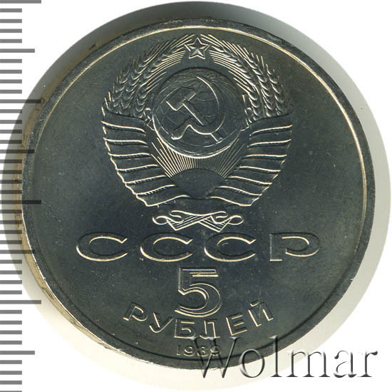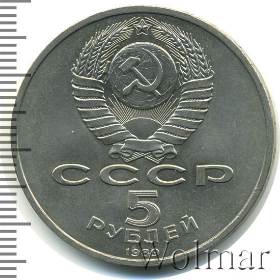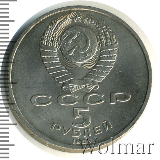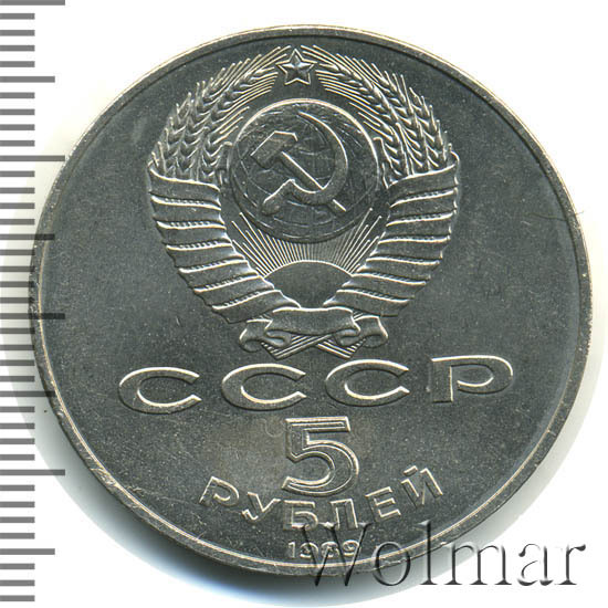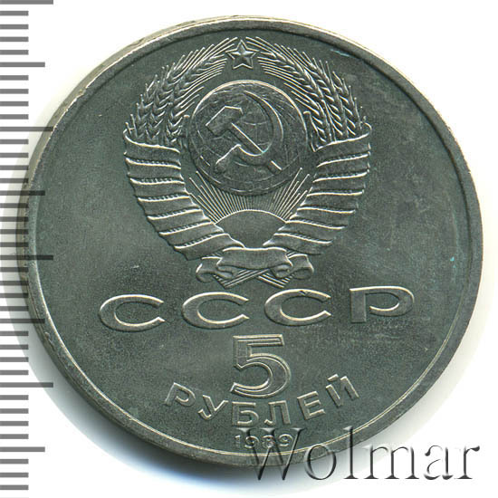 Сверху герб СССР с 15 витками ленты, под ним буквы «СССР», ниже обозначение достоинства монеты цифра «5» и ниже слово «РУБЛЕЙ», внизу у канта год выпуска монеты «1989».