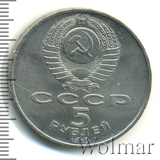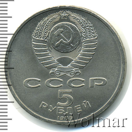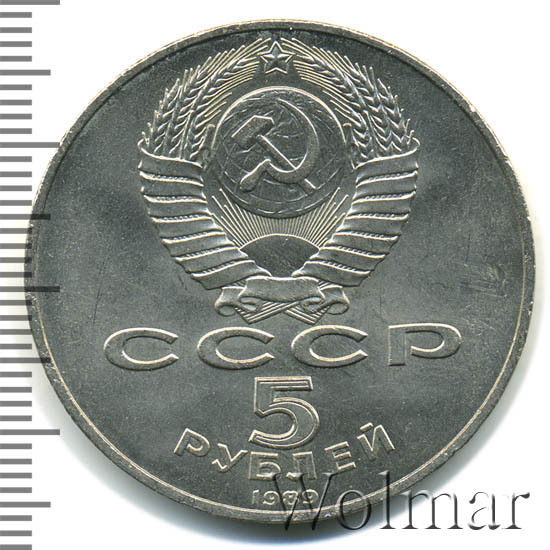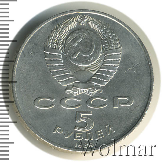 Сверху герб СССР с 15 витками ленты, под ним буквы «СССР», ниже обозначение достоинства монеты цифра «5» и ниже слово «РУБЛЕЙ», внизу у канта год выпуска монеты «1989».
