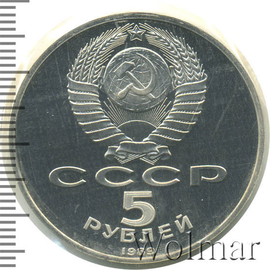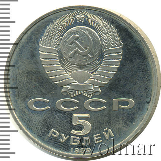 Сверху герб СССР с 15 витками ленты, под ним буквы «СССР», ниже обозначение достоинства монеты цифра «5» и ниже слово «РУБЛЕЙ», внизу у канта год выпуска монеты «1989».
