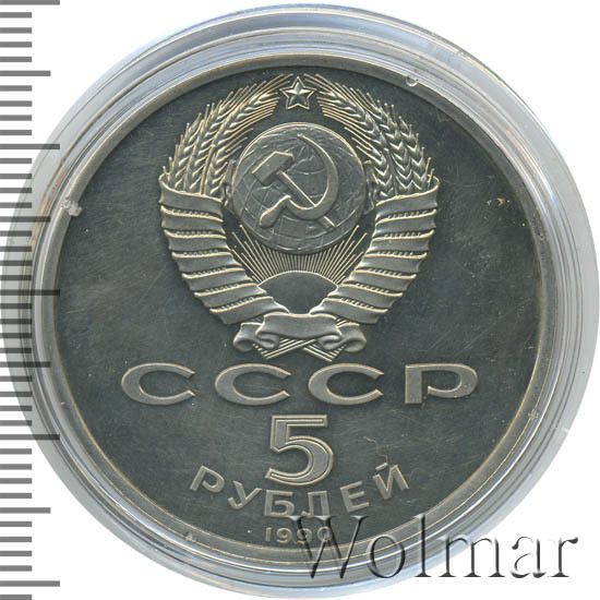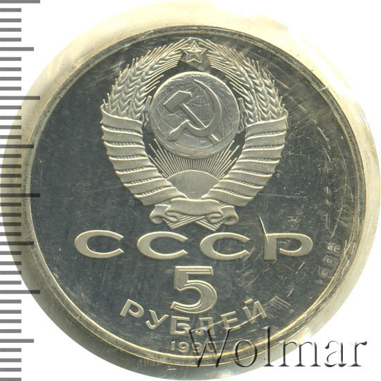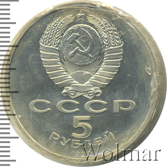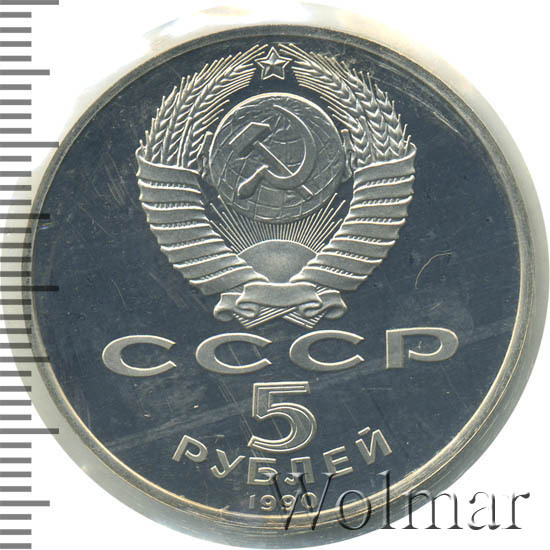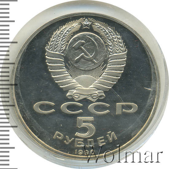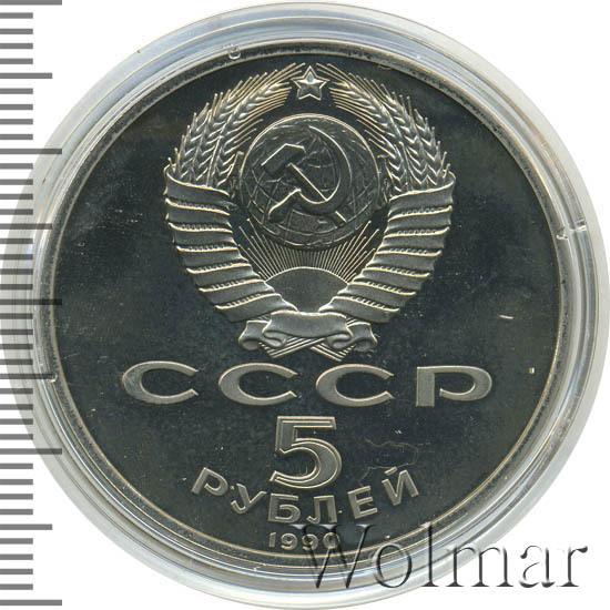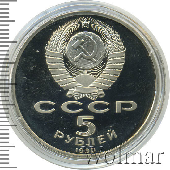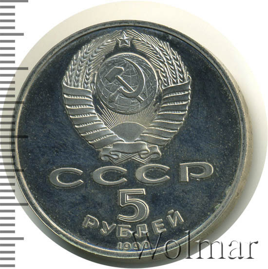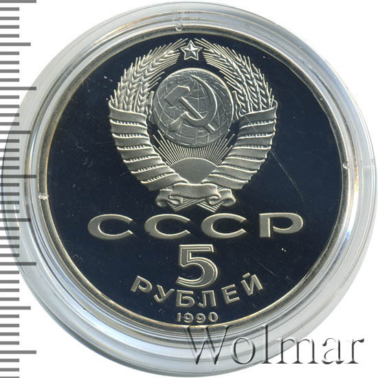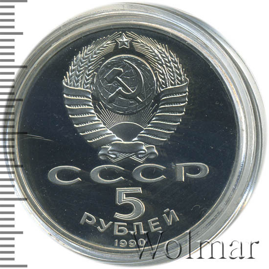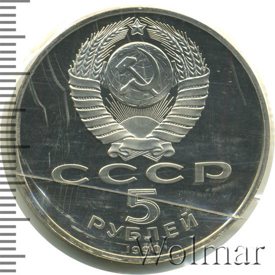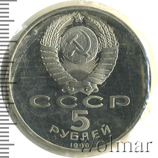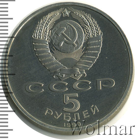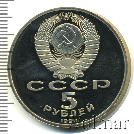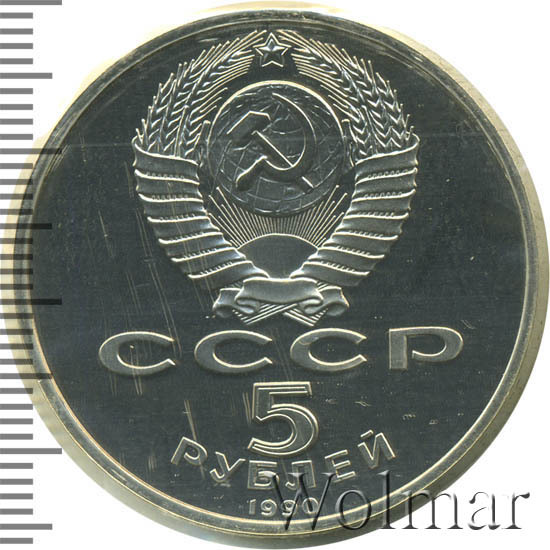 Сверху герб СССР с 15 витками ленты, под ним буквы «СССР», ниже обозначение достоинства монеты цифра «5» и ниже слово «РУБЛЕЙ», внизу у канта год выпуска монеты «1990».