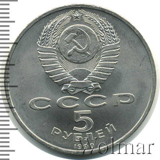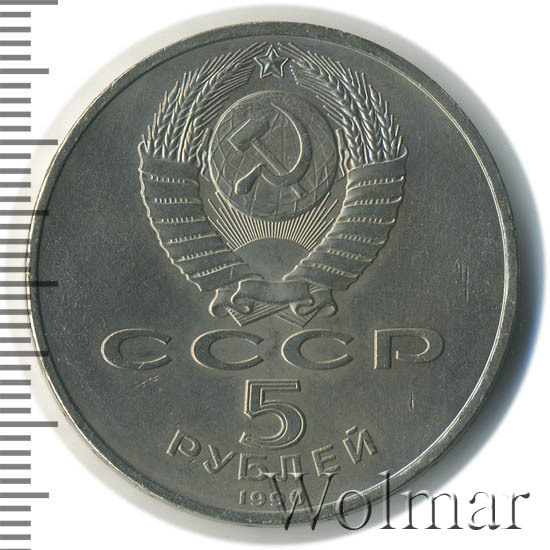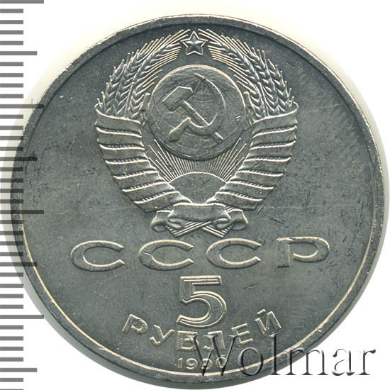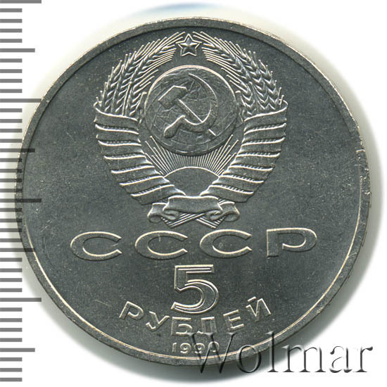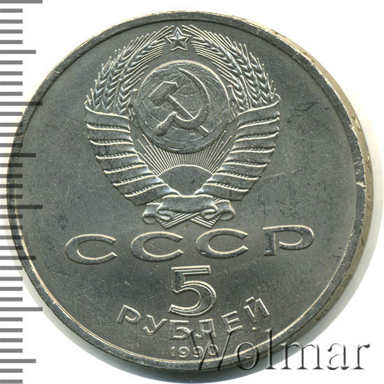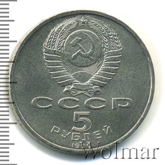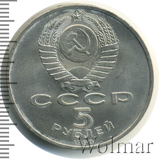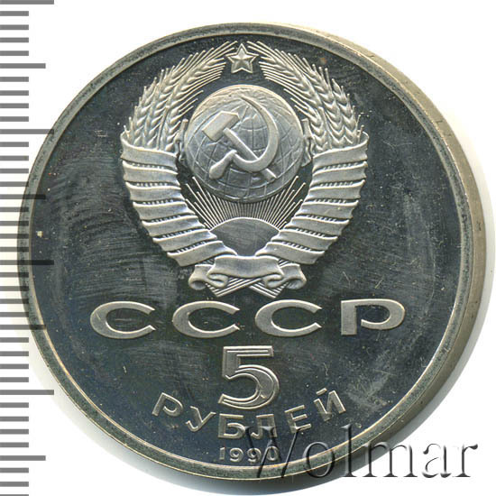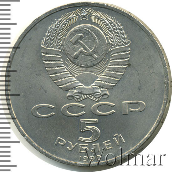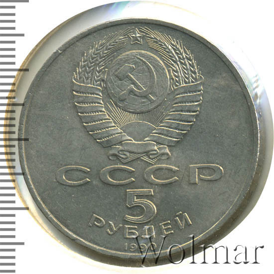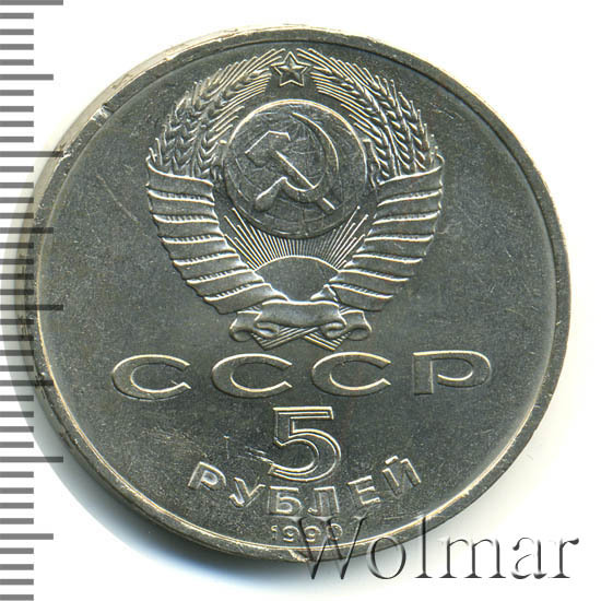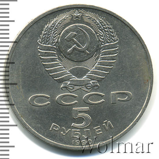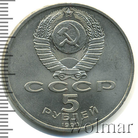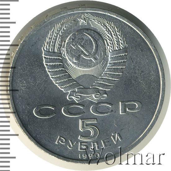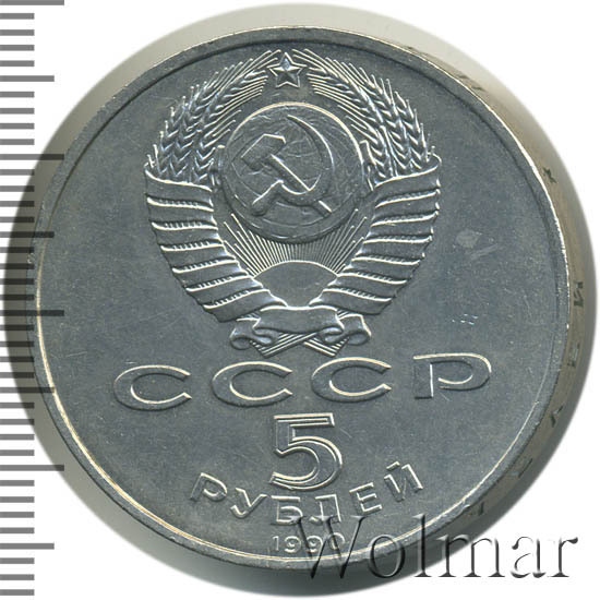 Сверху герб СССР с 15 витками ленты, под ним буквы «СССР», ниже обозначение достоинства монеты цифра «5» и ниже слово «РУБЛЕЙ», внизу у канта год выпуска монеты «1990».