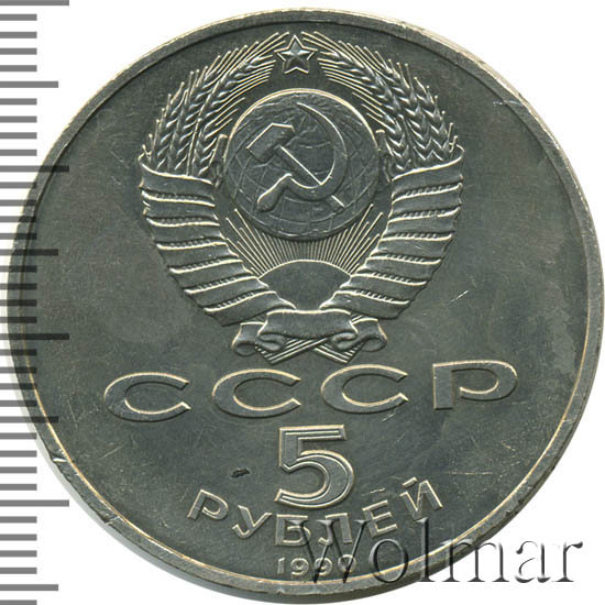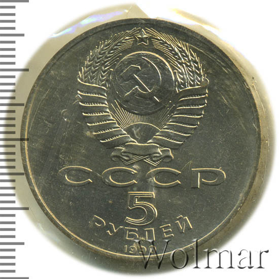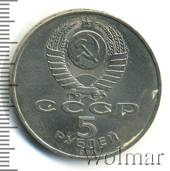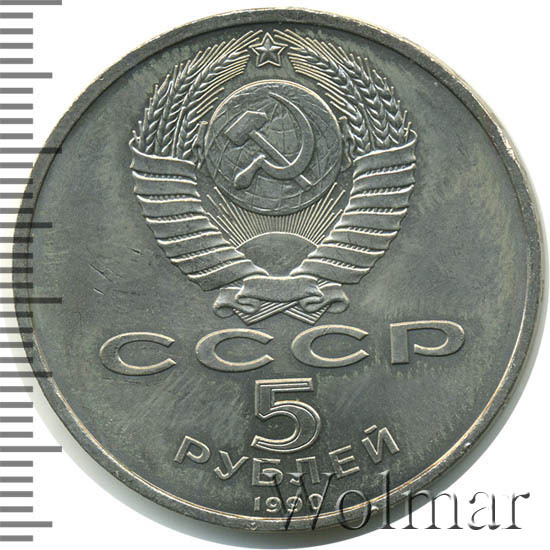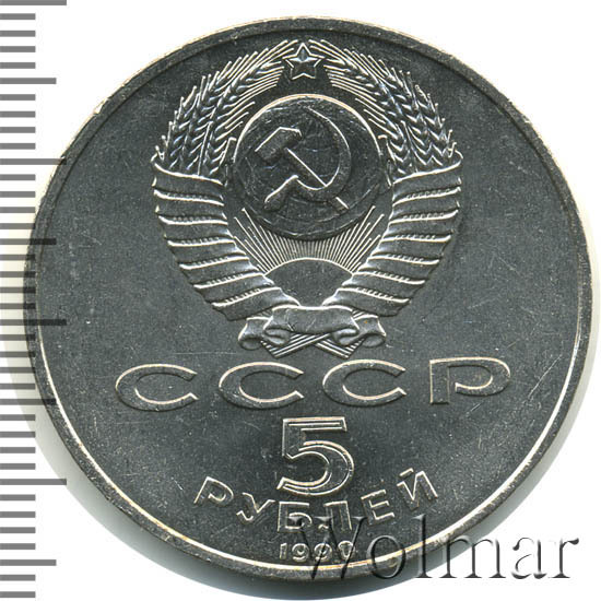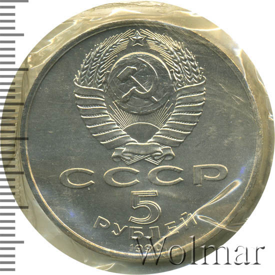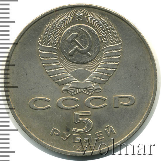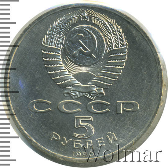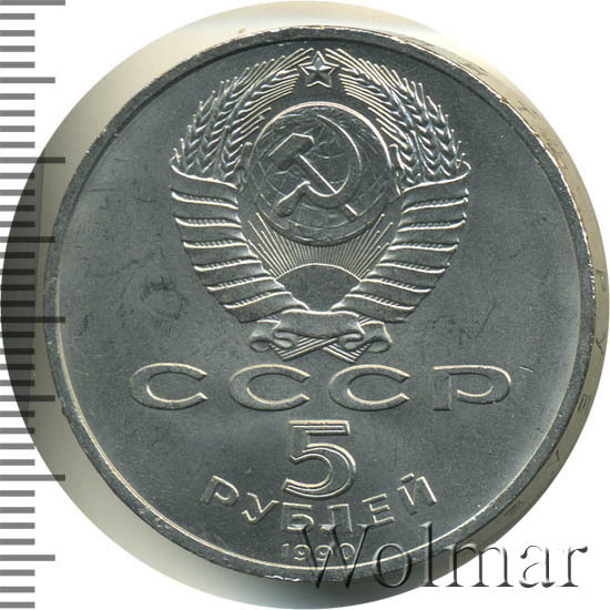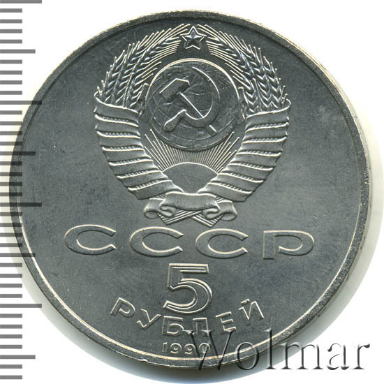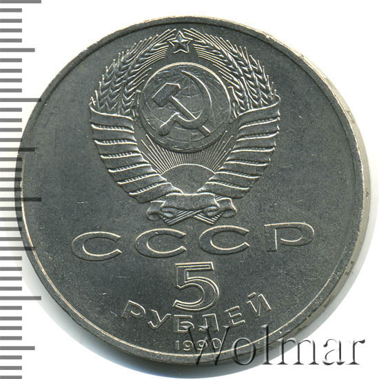 Сверху герб СССР с 15 витками ленты, под ним буквы «СССР», ниже обозначение достоинства монеты цифра «5» и ниже слово «РУБЛЕЙ», внизу у канта год выпуска монеты «1990».