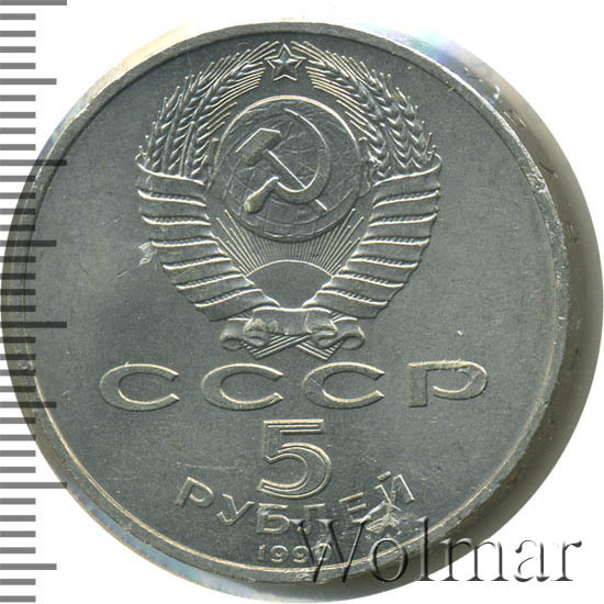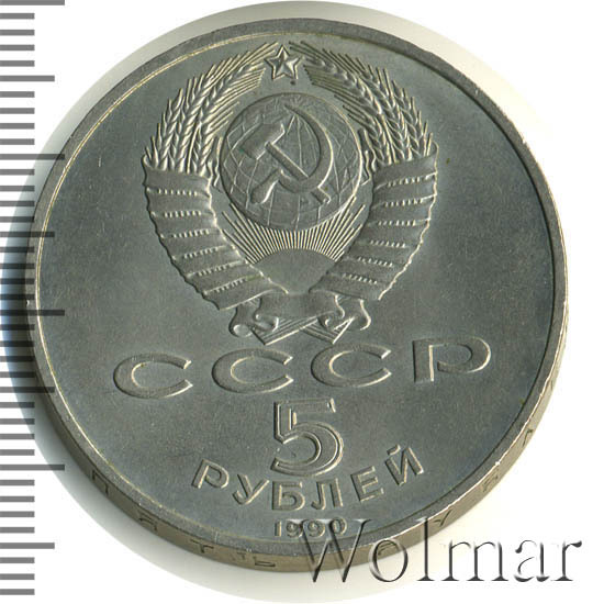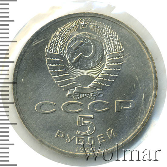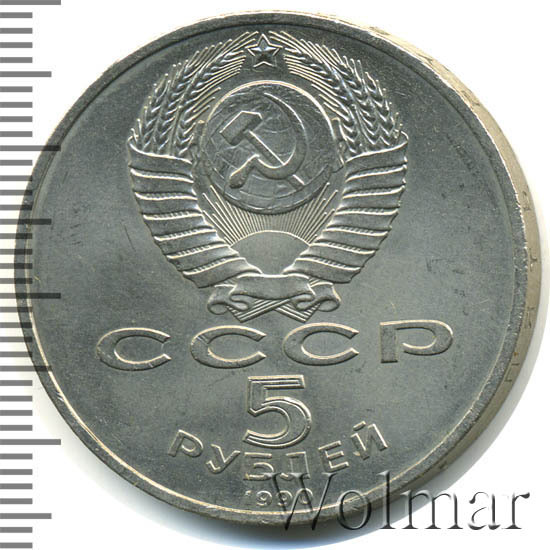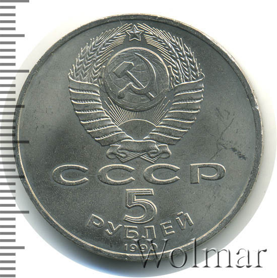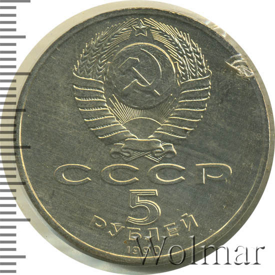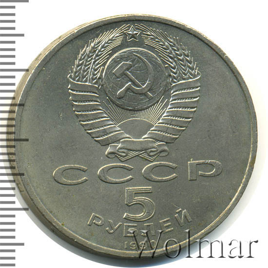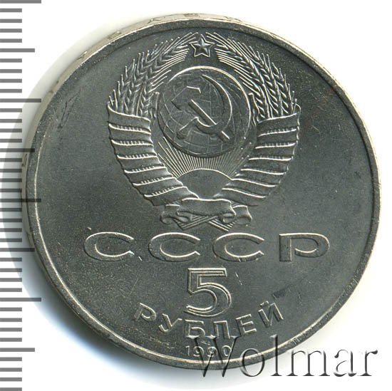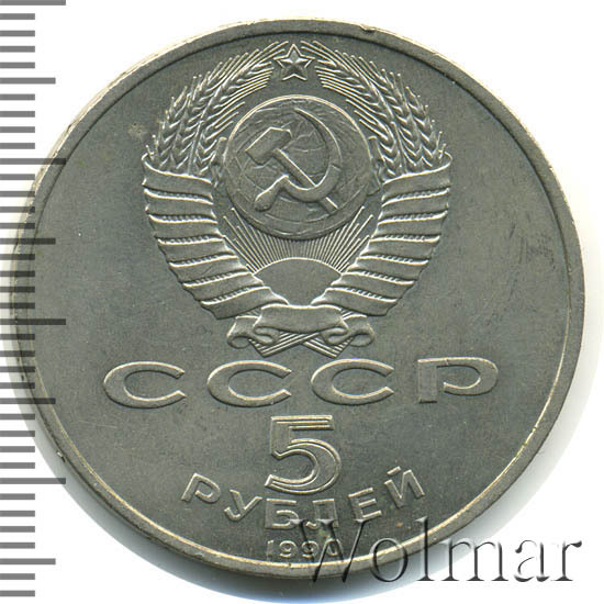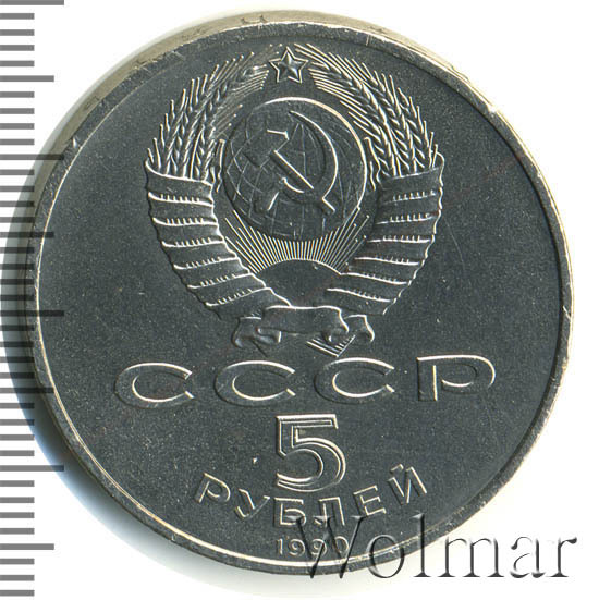 Сверху герб СССР с 15 витками ленты, под ним буквы «СССР», ниже обозначение достоинства монеты цифра «5» и ниже слово «РУБЛЕЙ», внизу у канта год выпуска монеты «1990».