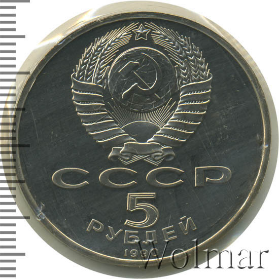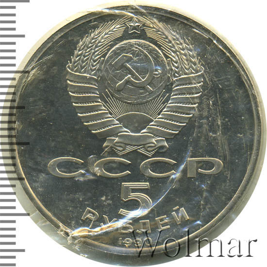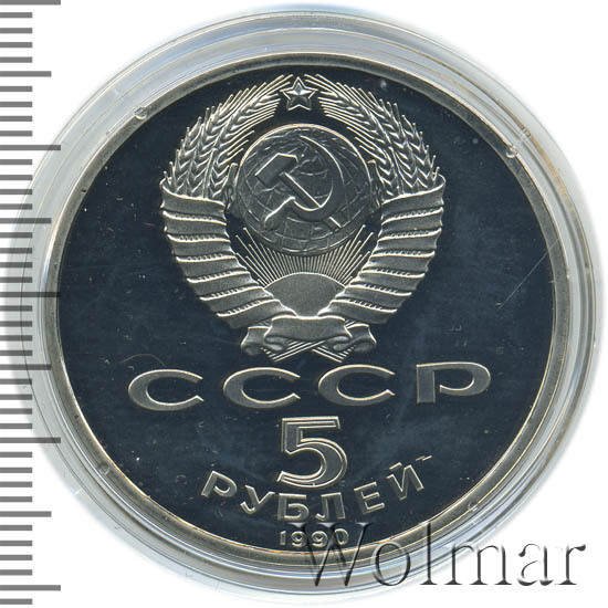 Сверху герб СССР с 15 витками ленты, под ним буквы «СССР», ниже обозначение достоинства монеты цифра «5» и ниже слово «РУБЛЕЙ», внизу у канта год выпуска монеты «1990».