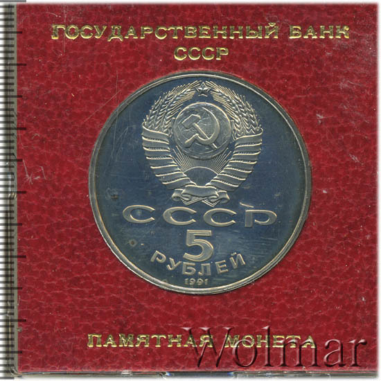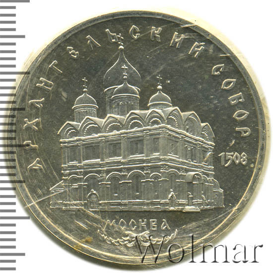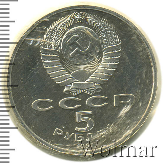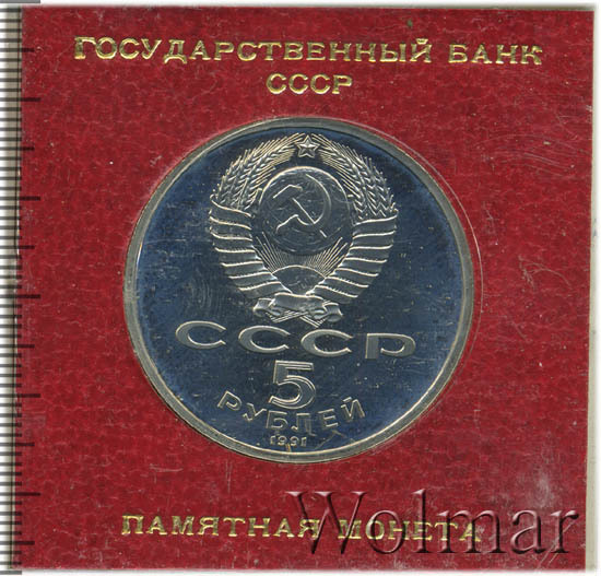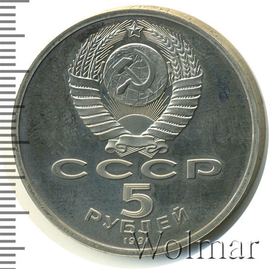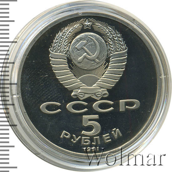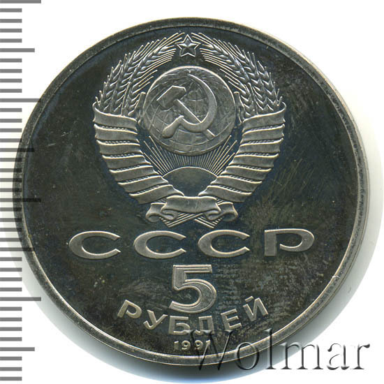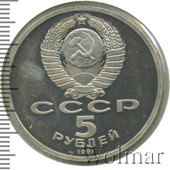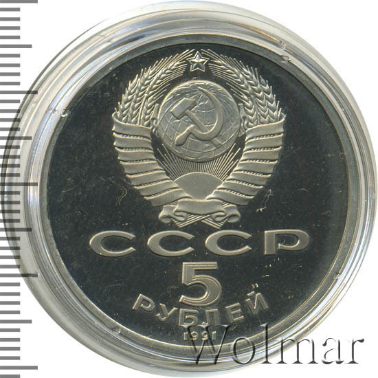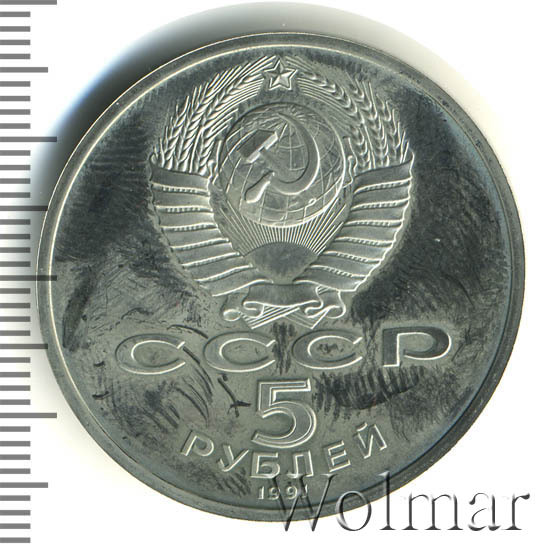 Сверху герб СССР с 15 витками ленты, под ним буквы «СССР», ниже обозначение достоинства монеты цифра «5» и ниже слово «РУБЛЕЙ», внизу у канта год выпуска монеты «1991».