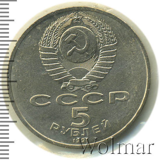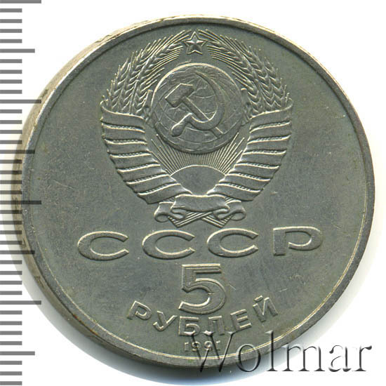 Сверху герб СССР с 15 витками ленты, под ним буквы «СССР», ниже обозначение достоинства монеты цифра «5» и ниже слово «РУБЛЕЙ», внизу у канта год выпуска монеты «1991».