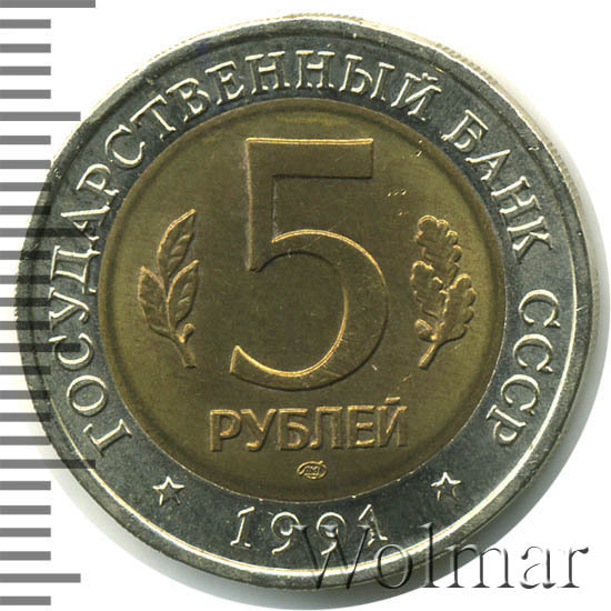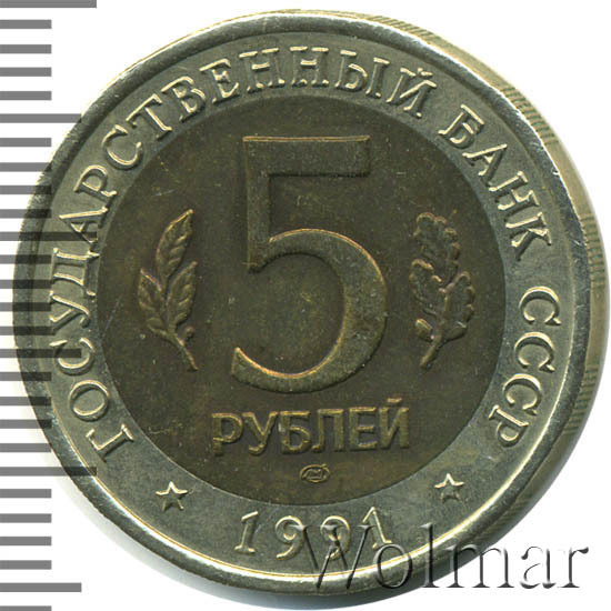 сверху вдоль края монеты слова «ГОСУДАРСТВЕННЫЙ БАНК СССР», внизу год чеканки «1991», в середине номинал «5», слева - лавровая ветвь, справа - дубовая ветвь, ниже слово «РУБЛЕЙ», ниже монограмма монетного двора «ЛМД».