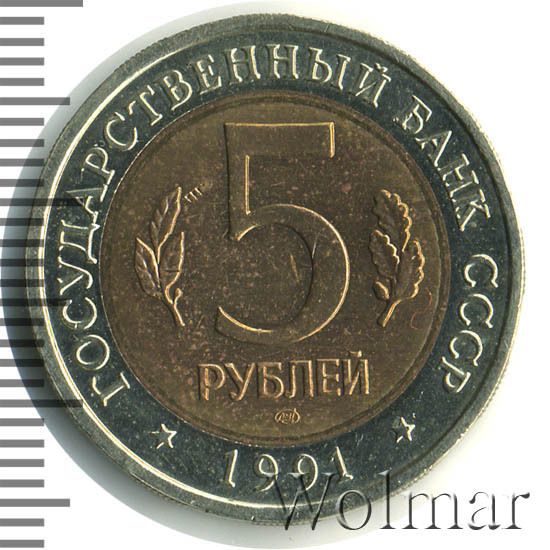 сверху вдоль края монеты слова «ГОСУДАРСТВЕННЫЙ БАНК СССР», внизу год чеканки «1991», в середине номинал «5», слева - лавровая ветвь, справа - дубовая ветвь, ниже слово «РУБЛЕЙ», ниже монограмма монетного двора «ЛМД».