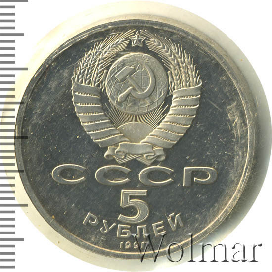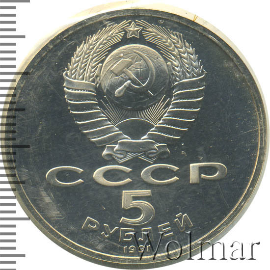 Сверху герб СССР с 15 витками ленты, под ним буквы «СССР», ниже обозначение достоинства монеты цифра «5» и ниже слово «РУБЛЕЙ», внизу у канта год выпуска монеты «1991».