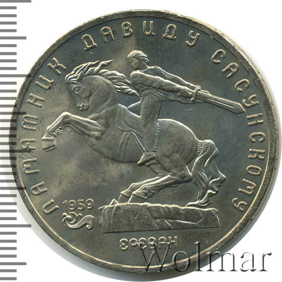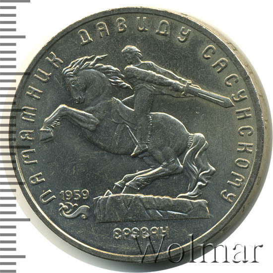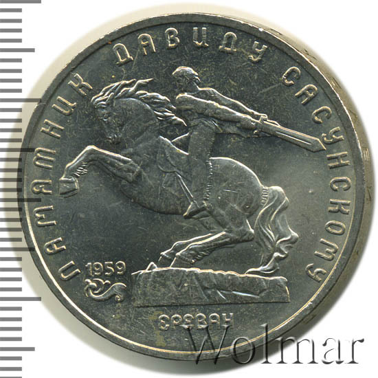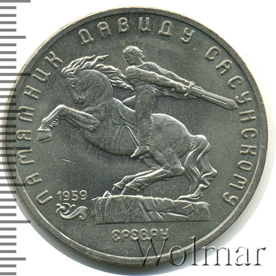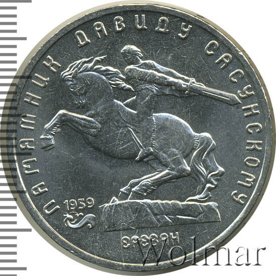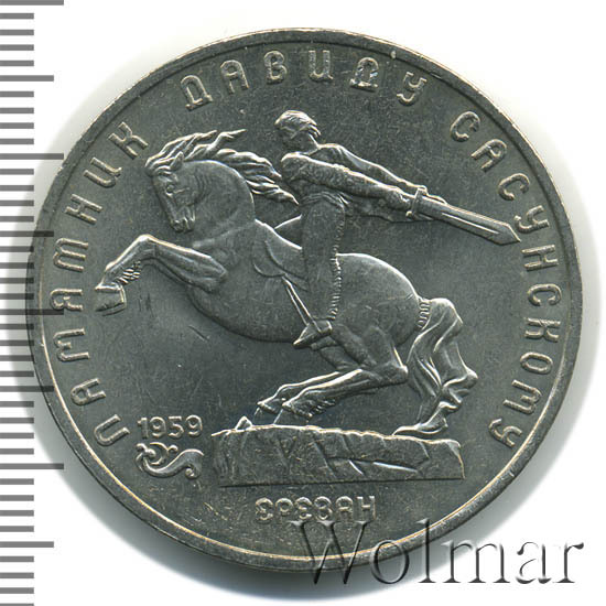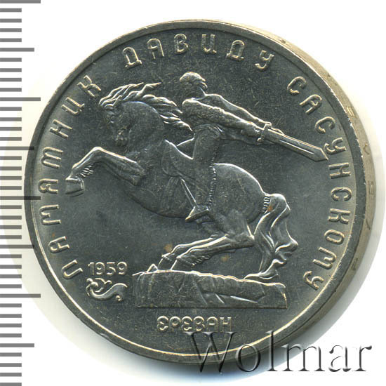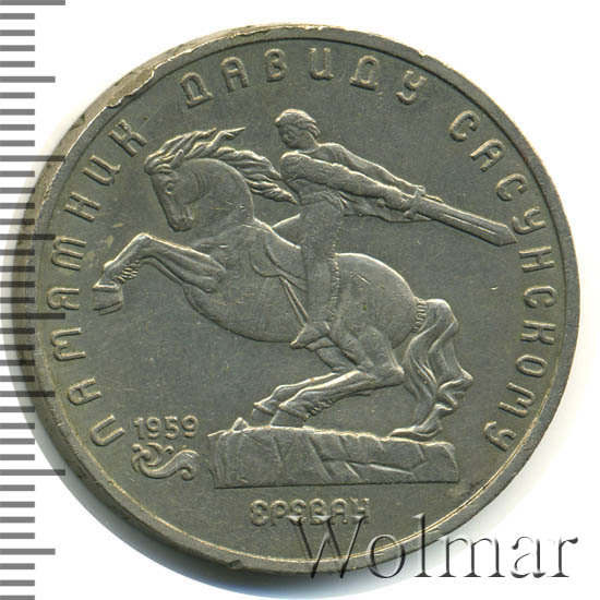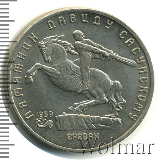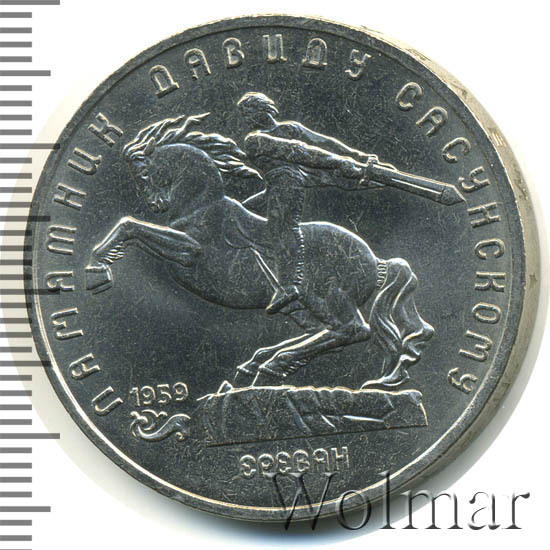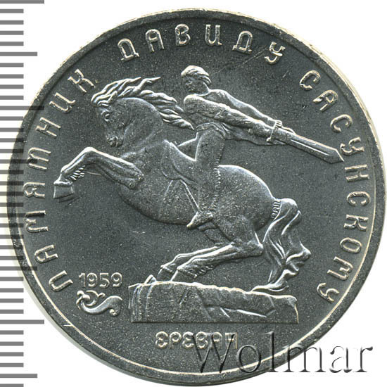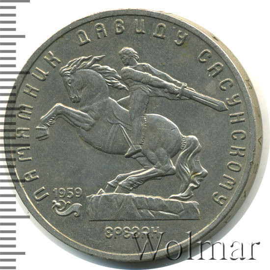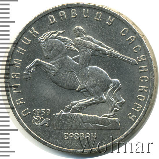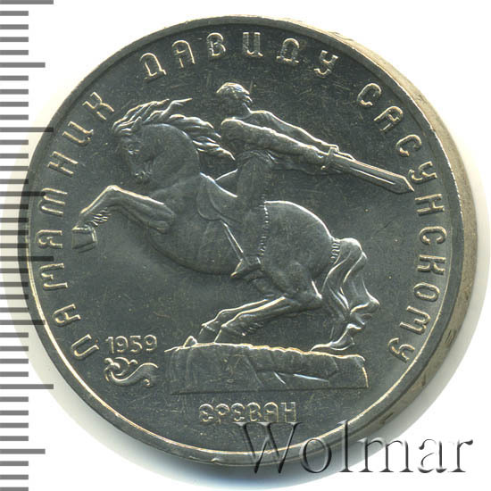 В центре изображение памятника Давиду Сасунскому. Под ним надпись «ЕРЕВАН». Слева от постамента дата «1959», а под ней декоративная виньетка. Вверху вдоль внешнего ободка монеты полукругом надпись «ПАМЯТНИК ДАВИДУ САСУНСКОМУ».