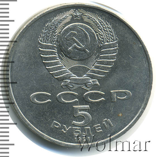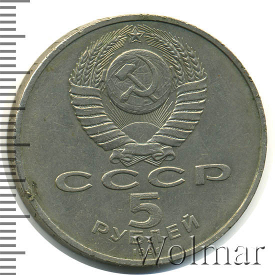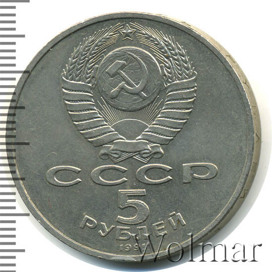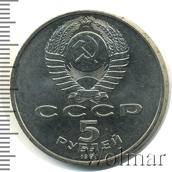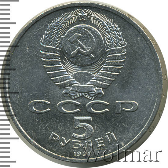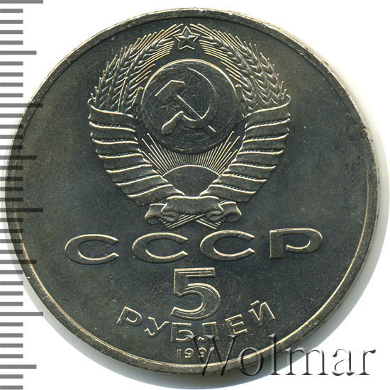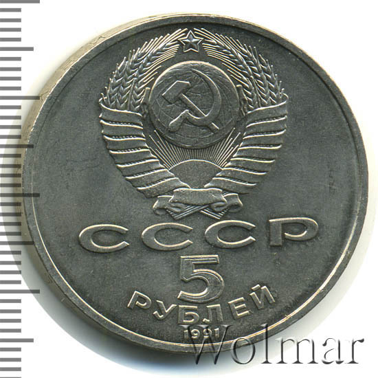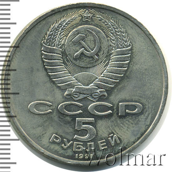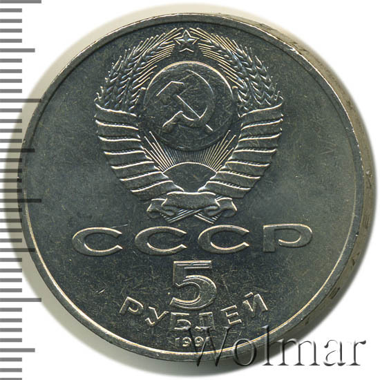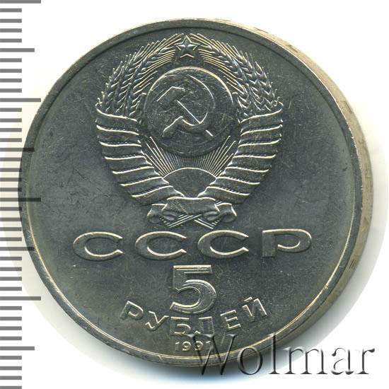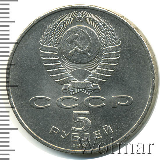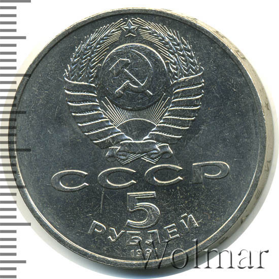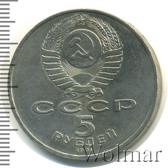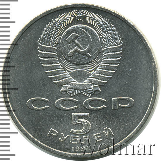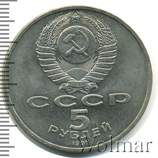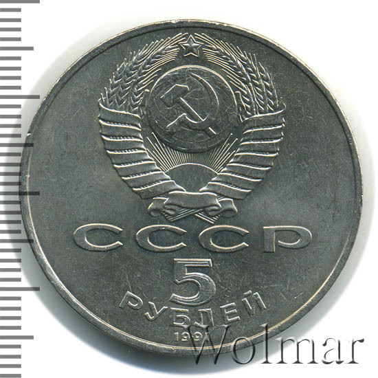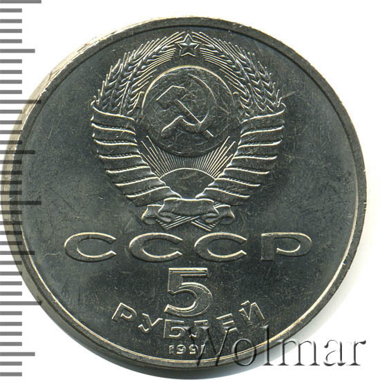 Сверху герб СССР с 15 витками ленты, под ним буквы «СССР», ниже обозначение достоинства монеты цифра «5» и ниже слово «РУБЛЕЙ», внизу у канта год выпуска монеты «1991».