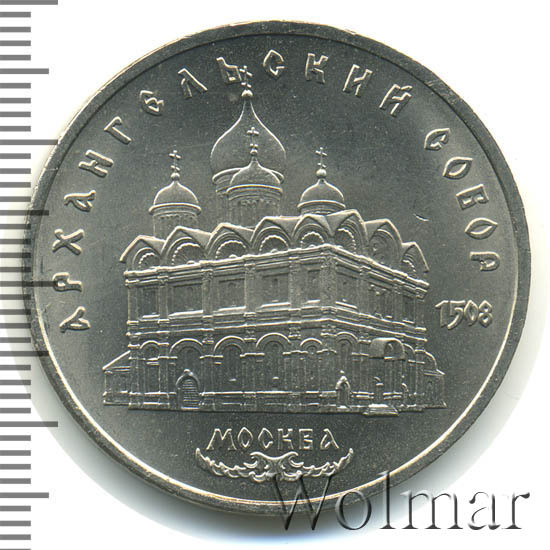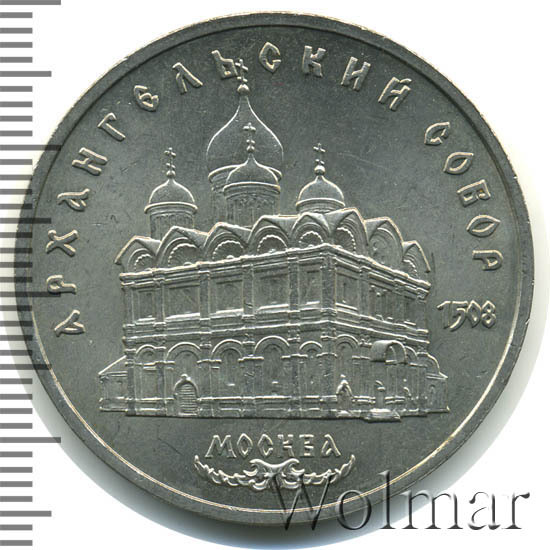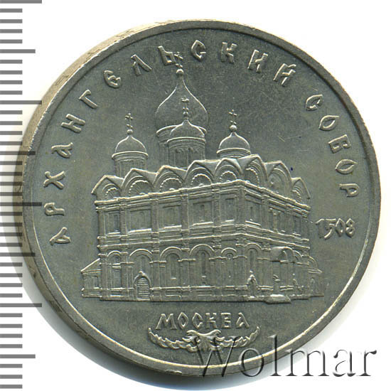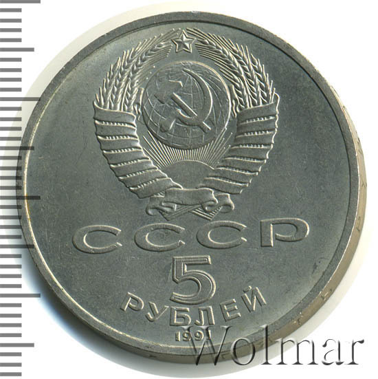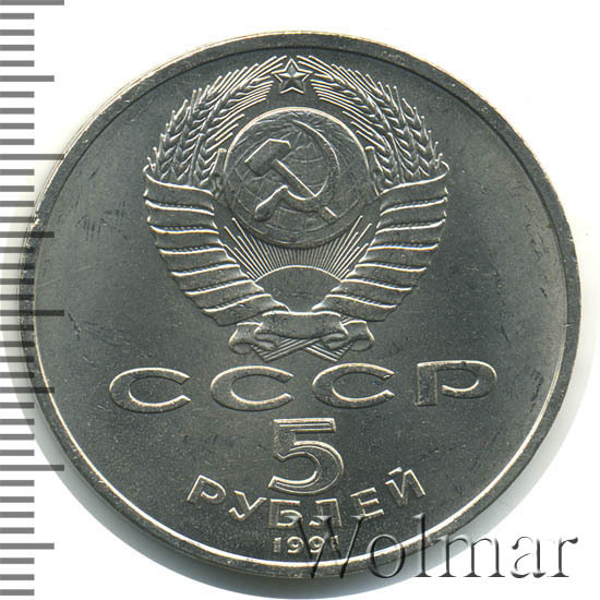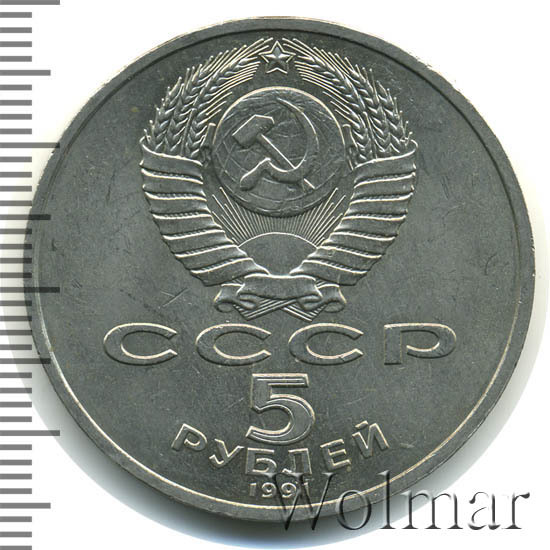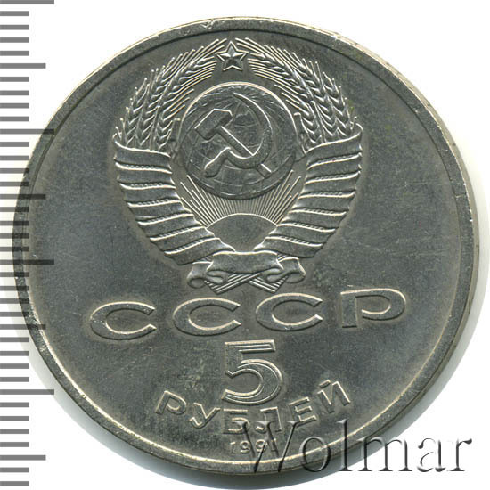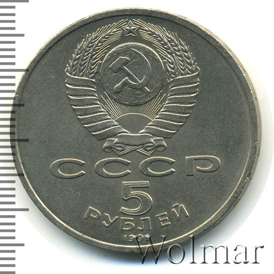Сверху герб СССР с 15 витками ленты, под ним буквы «СССР», ниже обозначение достоинства монеты цифра «5» и ниже слово «РУБЛЕЙ», внизу у канта год выпуска монеты «1991».