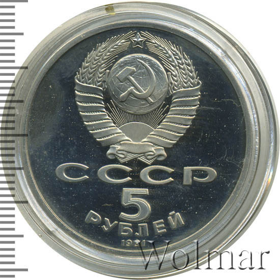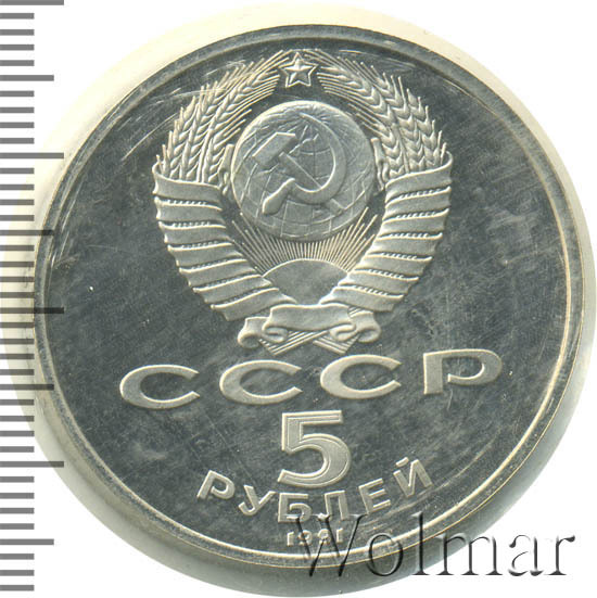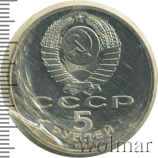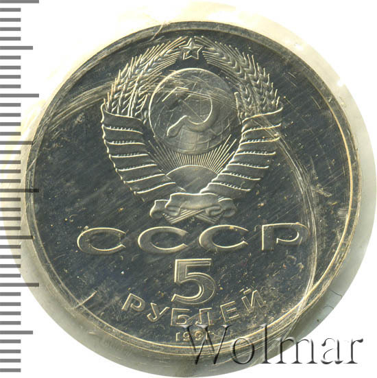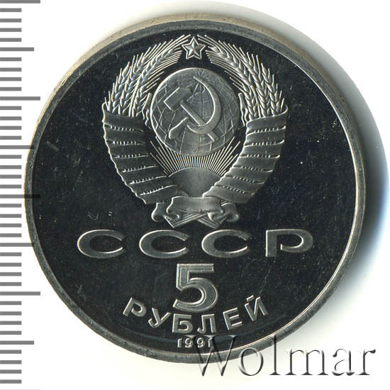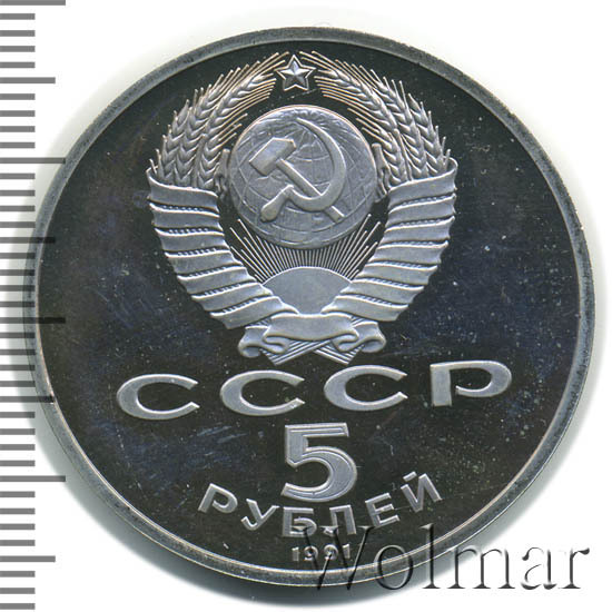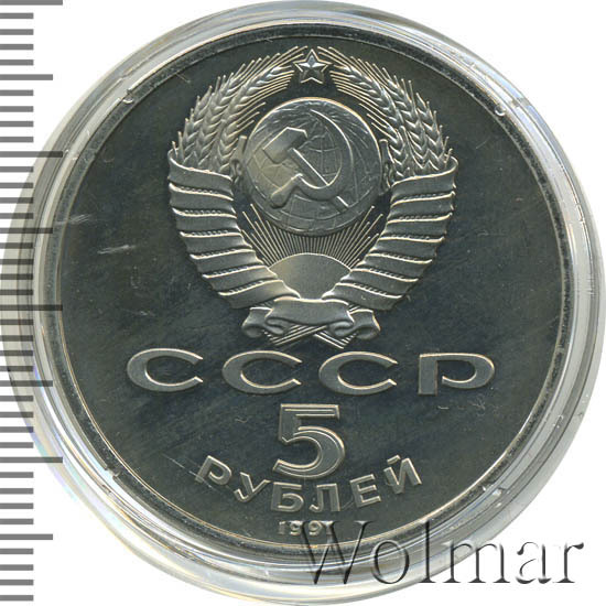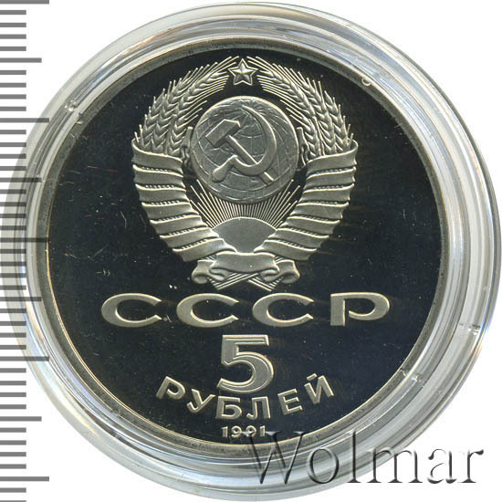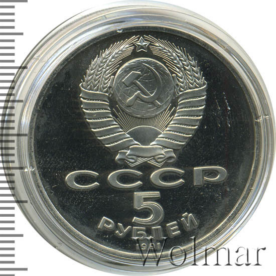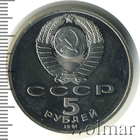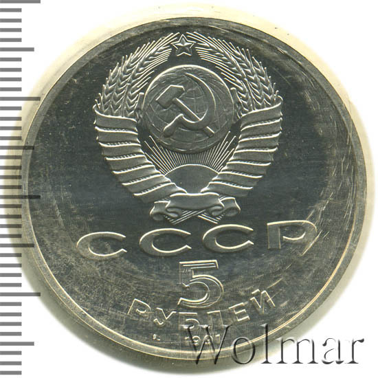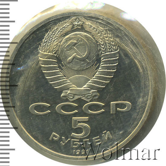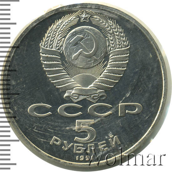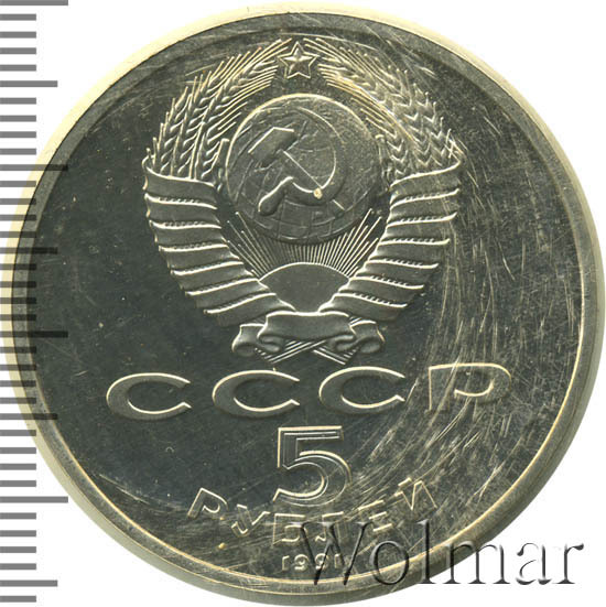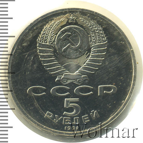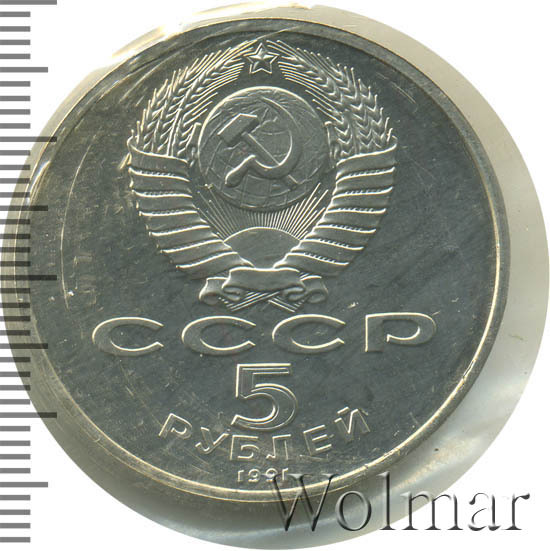 Сверху герб СССР с 15 витками ленты, под ним буквы «СССР», ниже обозначение достоинства монеты цифра «5» и ниже слово «РУБЛЕЙ», внизу у канта год выпуска монеты «1991».