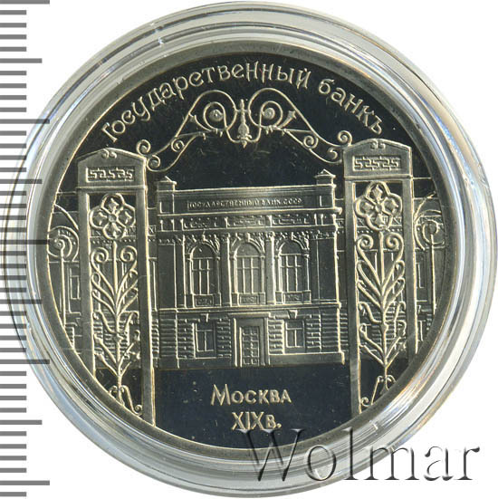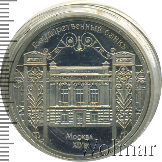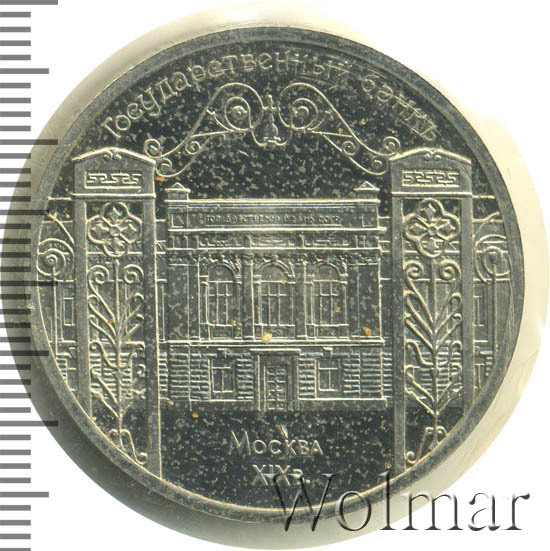 В центре изображение узорчатых ворот на фоне здания Государственного банка в г. Москве. Вверху вдоль внешнего ободка монеты полукругом надпись «ГОСУДАРСТВЕННЫЙ БАНКЪ». Внизу в две строки надпись «МОСКВА XIX в.».