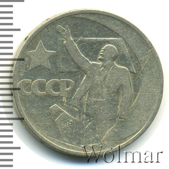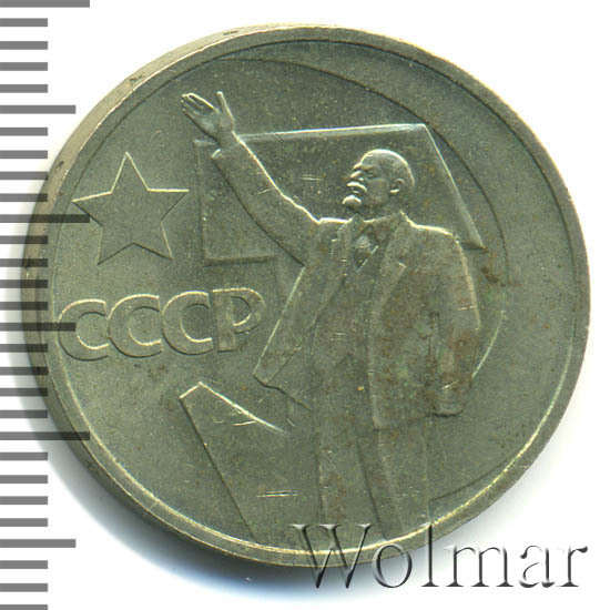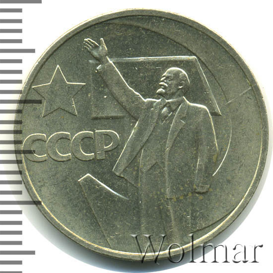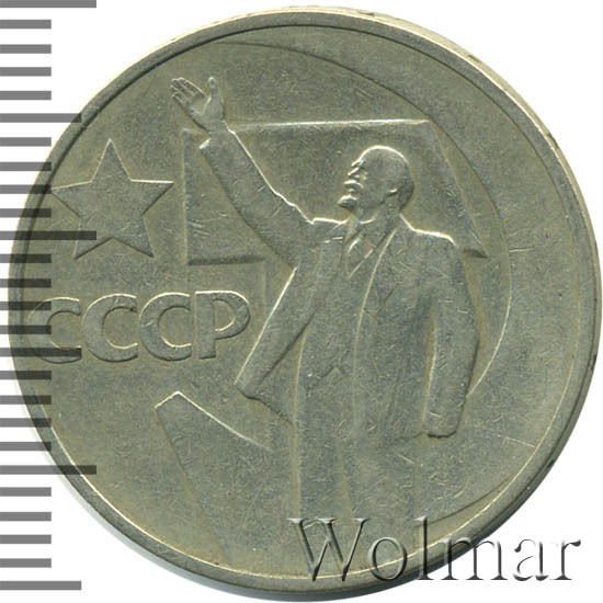 Осенью 1967 в нашей стране проходили торжества по случаю пятидесятилетия Октябрьской революции. Временное правительство было свергнуто в результате переворота и к власти пришли большевики во главе с "бессмертным" вождём. Впоследствии, это и подобные изображения Владимира Ильича, указывающего нам путь в светлое коммунистическое будущее, стали символом целой 30-ти летней эпохи заката и развала СССР. Для чеканки использовался традиционный немагнитный медно-никелевый сплав металла. Реверс 50 копеек украшает изображение Ленина, на фоне серпа с молотом во весь рост с вытянутой вперёд правой рукой. На лицевой стороне полтинника находится рисунок герба государства и надпись: "пятьдесят лет советской власти". По гурту монеты расположены чередующиеся круглые точки и звездочки (всего 8 таких пар).