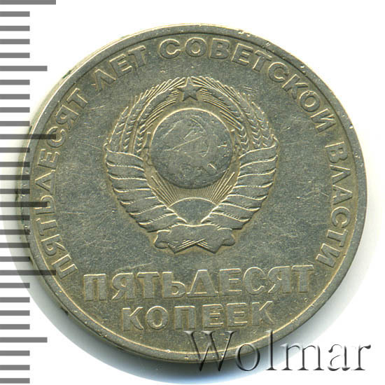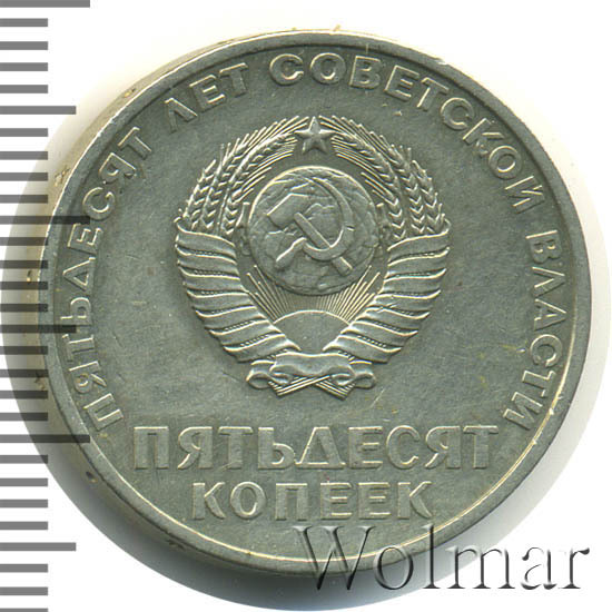 Сверху вдоль края монеты слова «ПЯТЬДЕСЯТ ЛЕТ СОВЕТСКОЙ ВЛАСТИ», в центре герб СССР с 15 витками ленты, под ним обозначение достоинства монеты «ПЯТЬДЕСЯТ» и ниже слово «КОПЕЕК».