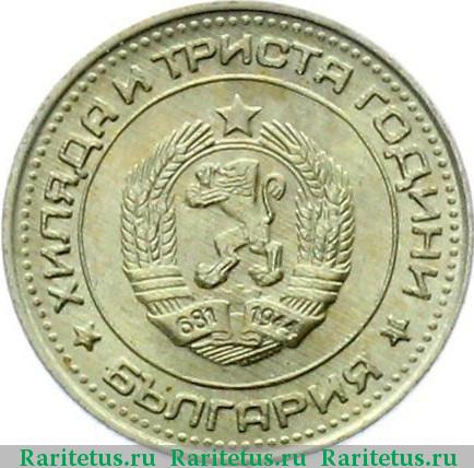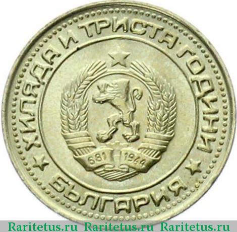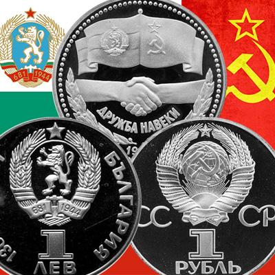 Со своей стороны, Болгария выпустила монету с точно таким же оформлением реверса номиналом 1 лев. В обычном качестве отчеканили 220 800 штук. Ещё 50 000 экземпляров добавили к основному тиражу в качестве «Proof». Сейчас трудно поверить, но был период, когда лев «Дружба навеки» стоил у продавцов дешевле такого же рубля. Поэтому при покупке монет в планшетном альбоме приходилось проверять «Дружбу» на аверс, чтобы не обнаружить там символику НРБ. Официальное название болгарской монеты длиннее советского – «1300 лет Болгарии - советско-болгарская дружба».