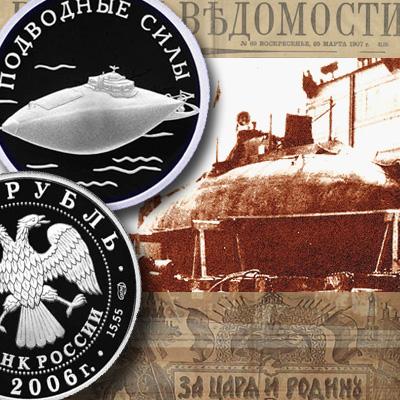Не они ли изображена на монете 2006 года? Нет, не она. Реверс украшает подлодка изобретателя Степана Карловича Джевецкого. Фамилия не на слуху, а ведь нам есть, чем гордиться! Подводные лодки Джевецкого могут считаться пионерами серийных боевых подводных аппаратов (первой в России и мире серийной подводной лодкой). Они были в строю российского флота уже в 1880-х годах. Рисунок выполнили художник Е.В. Крамская и скульптор М.А. Тимофеева. На второй монете мы видим современный подводный атомный ракетоносец. Как символ, над ним изображена птица, раскинувшая крылья. Художником, выполнившим рисунок, стал С.А. Козлов, а до барельефа изображение довёл скульптор А.Н. Бессонов. Третья монета серии уже традиционно отдана под эмблему. Так как подводные войска входят в состав Военно-морского флота России, то на реверсе мы видим эмблему ВМФ Российской Федерации. Можно сказать, что выпуск пришёлся на вековой юбилей подводных войск. "Не может быть! - скажут неверующие. - Тот же "Сом" закуплен аж в 1904 году! И он - далеко не первая подлодка России". Действительно, почему отсчёт ведётся от 1906 года? Оказывается, именно 19 марта этого года в Санкт-Петербурге запустили процесс обучения в специально созданной Школе подводного плавания. Дата стала для подводников России знаковой. Выпуск монет произведён 1 декабря.
