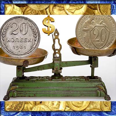 - 20 копеек 1931 года (Ag), сохранность AU-UNC – от 200000
