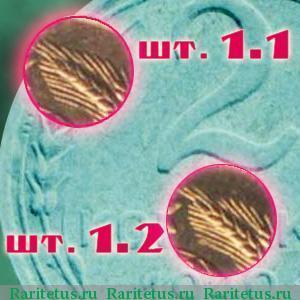 Но в ряде каталогов происходит деление на "Шт.1.1" и "Шт.1.2", где герб без уступа на внешней гребенке остей колосьев, расположенных справа от звезды мы увидим на рисунке штемпеля "Шт.1.1". У "Шт.1.2" на этом месте тут будет наблюдаться явный уступ, так как одна из остей имеет укороченную длину. Оба варианта встречаются достаточно часто, поэтому на редкость конкретного экземпляра влияния не оказывают.