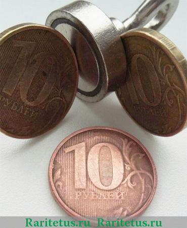 Указывалось, что масса поддельной монеты около пяти грамм. И на одном из формов вскоре появилась десятка 2012 года, хозяин которой утверждал о полном отсутствии у неё магнитных свойств при весе в 4,7 грамма. Фотография гурта не выявила следов соединения половинок литьевой формы, поэтому обсуждение не привело к конкретному итогу. Сошлись на том, что подлинные экземпляры, побывавшие в агрессивной среде, приобретают схожий розовый оттенок из-за выхода меди на поверхность.