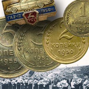 Самый маленький номинал этого периода имеет вес в один грамм. Диаметр монеты всего пятнадцать миллиметров. Толщина экземпляра, не затёртого обращением, составит девять десятых миллиметра. Взглянув на монету сбоку, мы заметим тот же рубчатый гурт. И снова по цене тут лидирует монета 1951 года, хотя копейка с датой "1950" практически сравнялась с ней по стоимости.