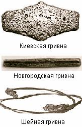 Самыми распространенными были две - киевская и новгородская. Первая имела меньшую массу (около 160 граммов) и отличалась правильной шестиугольной формой. Известен клад, в котором содержалось около полутора пудов серебра таких гривен (не только киевских, но и других городов). Наиболее уважаемой и распространенной на Руси считалась новгородская гривна массой около 200 граммов, имевшая вид серебряной палочки.