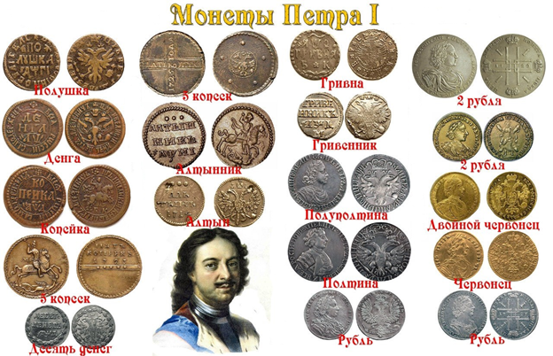 Оформление монеты при Петре приобрело отчетливый европейский характер. На лицевой стороне помещался царский портрет с указанием достоинства, года выпуска и места чеканки, а на оборотной - государственный герб. Чтобы защитить монеты от подделки, стали наносить надпись или особенный узор. К концу царствования Петра I в денежном хозяйстве страны применяли три основных металла. Монету достоинством 2 рубля чеканили из золота; рубль, полтину и гривенник - из серебра; 5 копеек, копейку, деньгу и полушку - из меди.